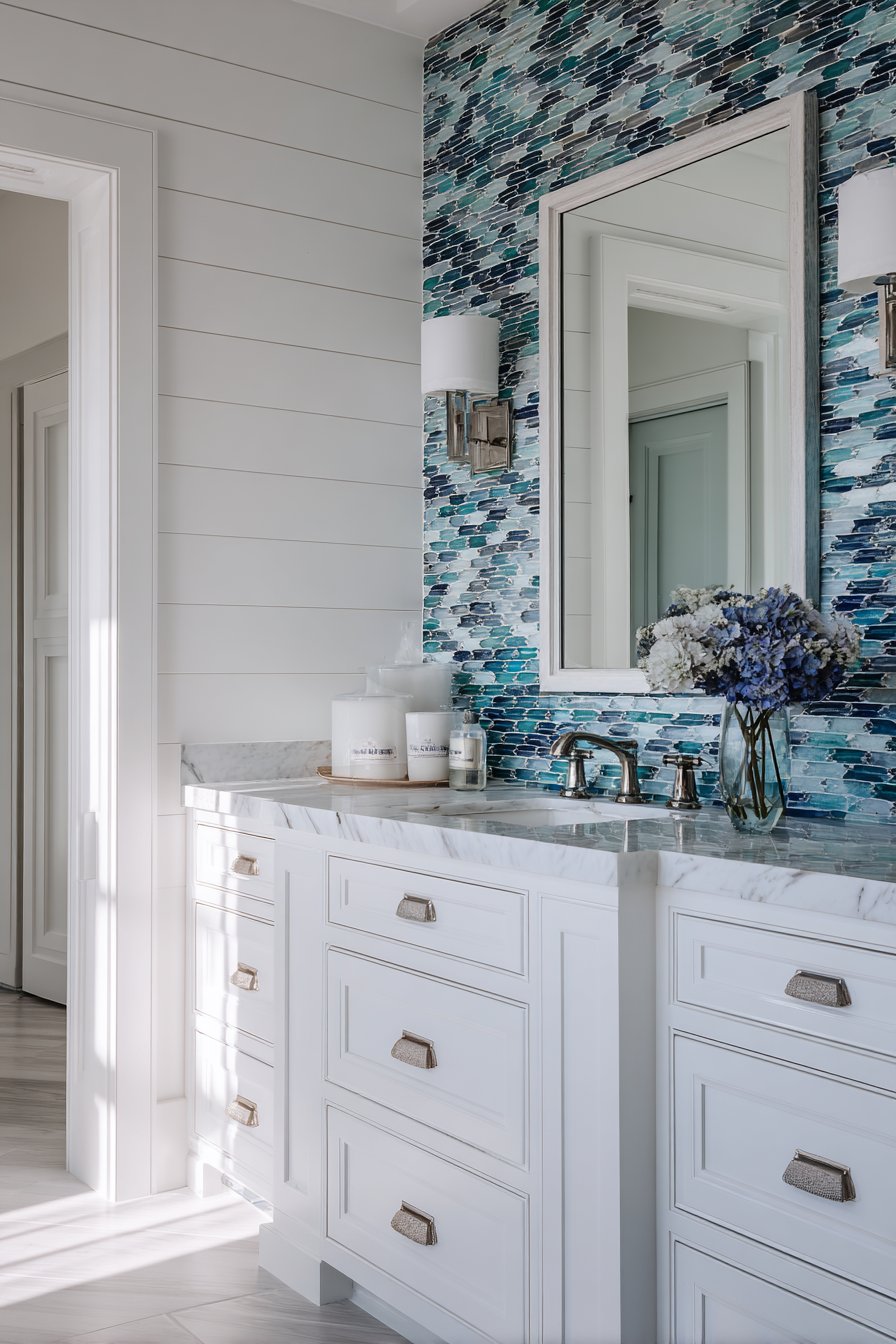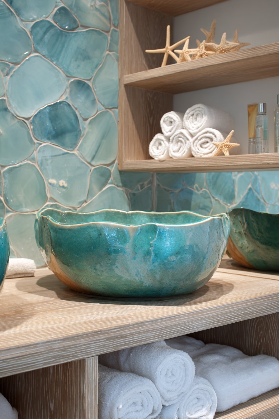 The backsplash becomes an artistic statement with handmade ceramic tiles in various shades of ocean blue, each piece slightly irregular in shape to mimic the organic quality of water ripples. This imperfection is intentional and desirable, adding depth and visual interest that machine-made tiles simply cannot achieve. The handcrafted nature of these tiles means each installation is unique, ensuring your bathroom has one-of-a-kind character that reflects the individuality of natural coastal environments.