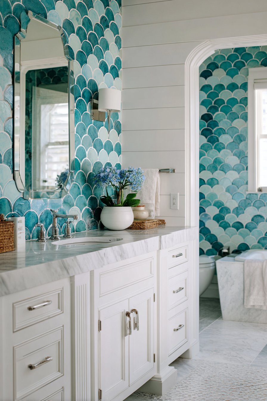 The backsplash steals the show with handmade ceramic tiles in various ocean blues arranged in a fish-scale pattern, also called scallop or mermaid tiles. This distinctive shape immediately evokes ocean associations while providing pattern that’s both striking and timeless. The handmade quality ensures slight variations in color intensity and shape between tiles, adding organic character that mass-produced tiles lack. The installation requires skilled craftsmanship to align the overlapping scales properly.