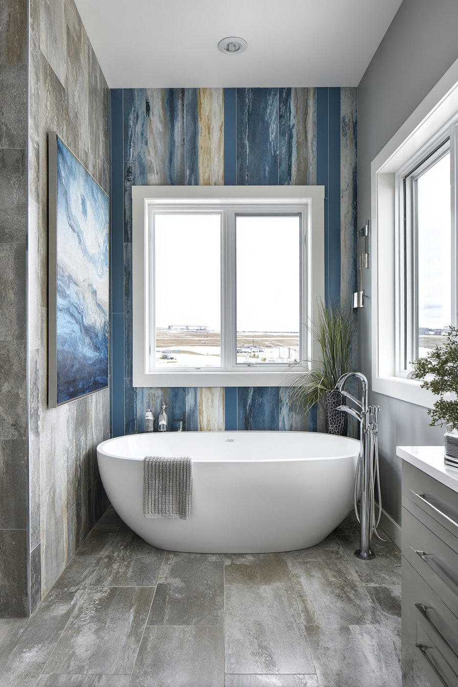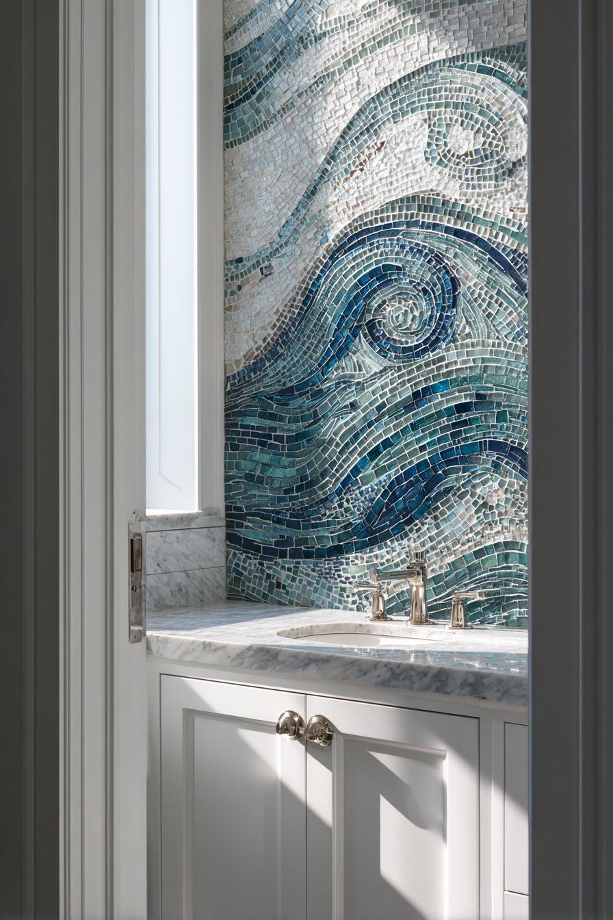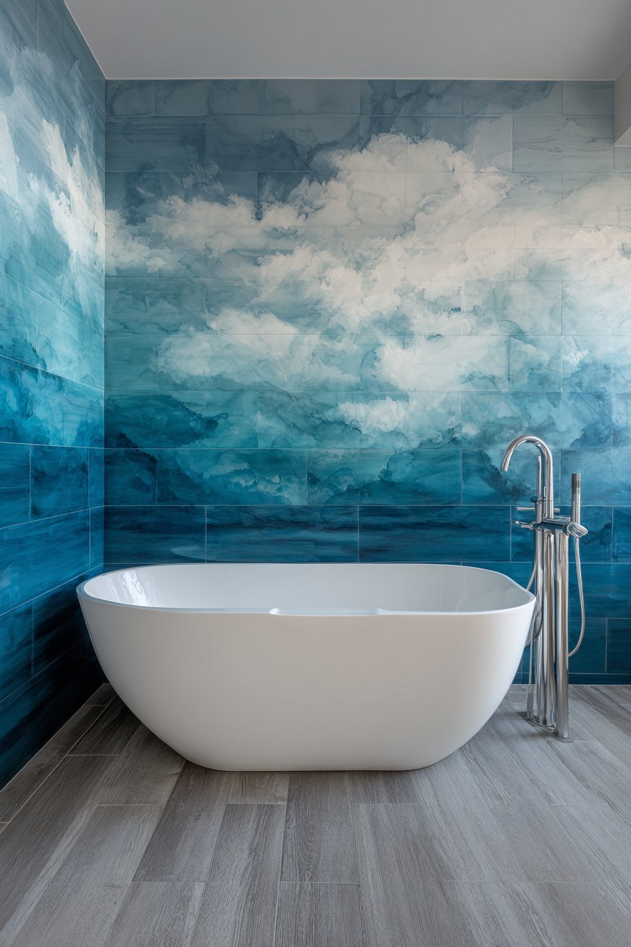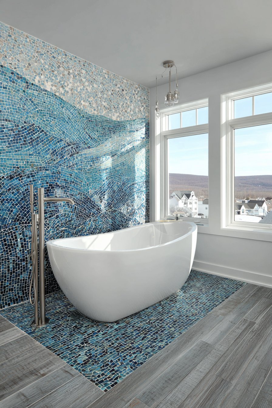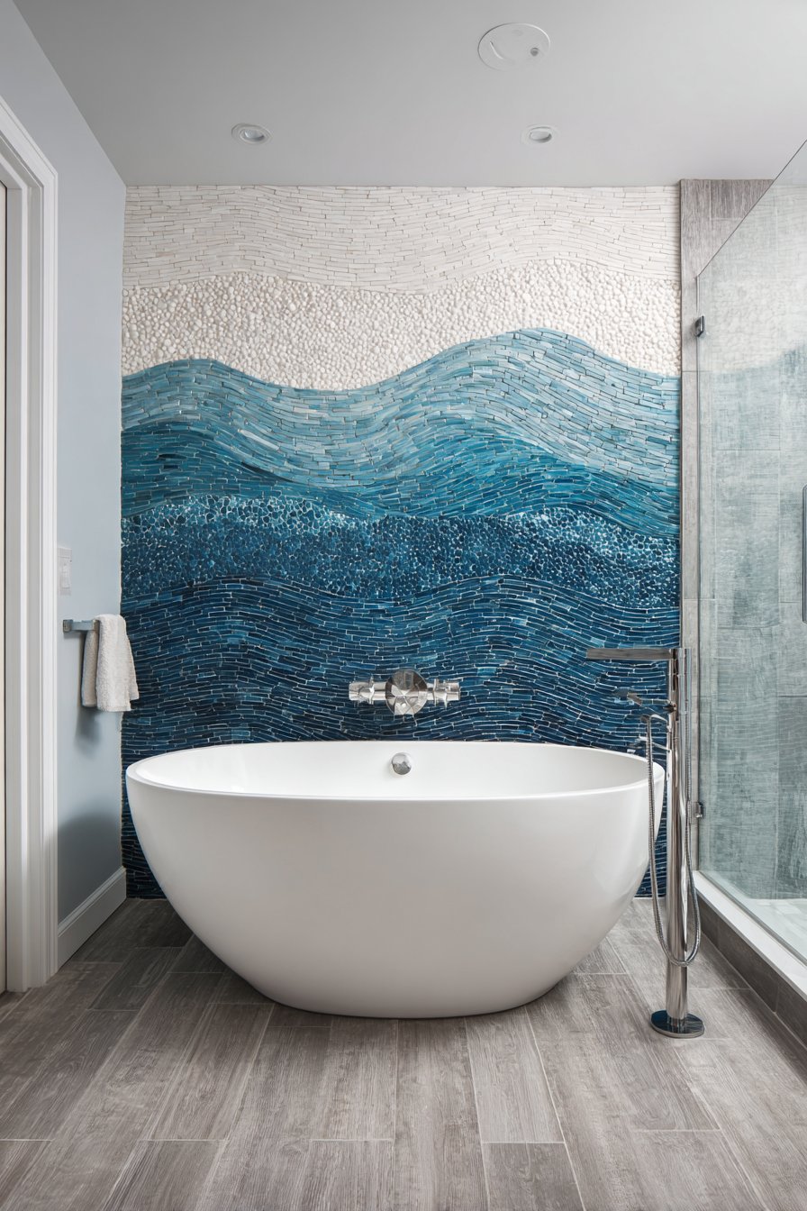 Artistic ambition defines this ocean bathroom idea renovation featuring a custom tile mural behind the bathtub depicting an abstract ocean horizon with handmade ceramic tiles in graduating blues. The mural creates a focal point worthy of contemplation during long soaks, its abstract nature allowing imagination to see different scenes depending on mood and light. Graduating blues from deep indigo at the bottom through medium ocean tones to pale aqua at the top with white tiles suggesting clouds create an impressionistic seascape.