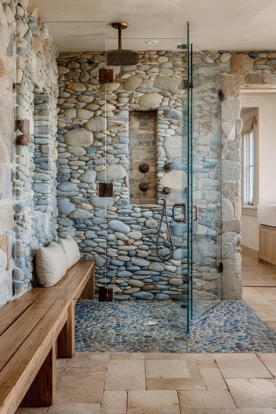 - Select pebble stone flooring with varied sizes and natural color variations for authenticity