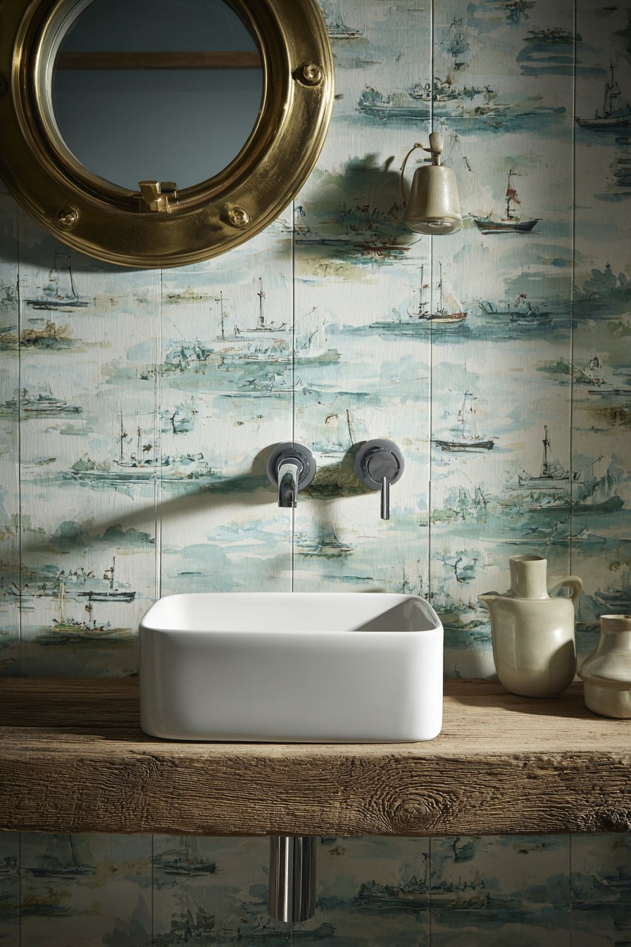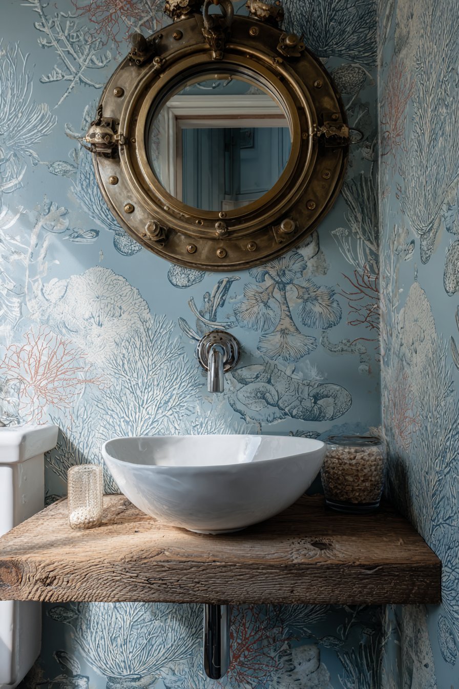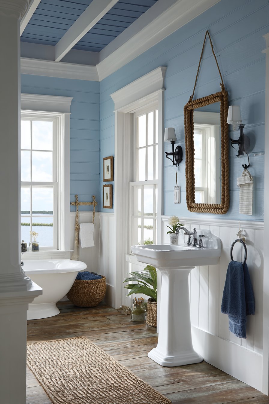 A round porthole-style mirror with rope detailing serves as the room’s focal point, its circular shape softening the strong horizontal lines of the shiplap and wainscoting. This maritime reference feels authentic rather than kitschy when executed with quality materials and proper scale. The rope wrapping around the mirror frame should show genuine texture and variation, not the plastic uniformity of cheap nautical decor.