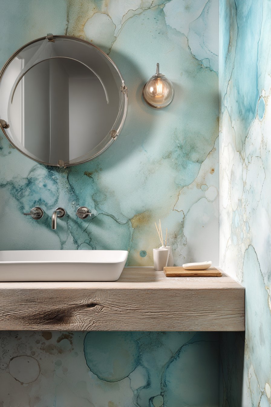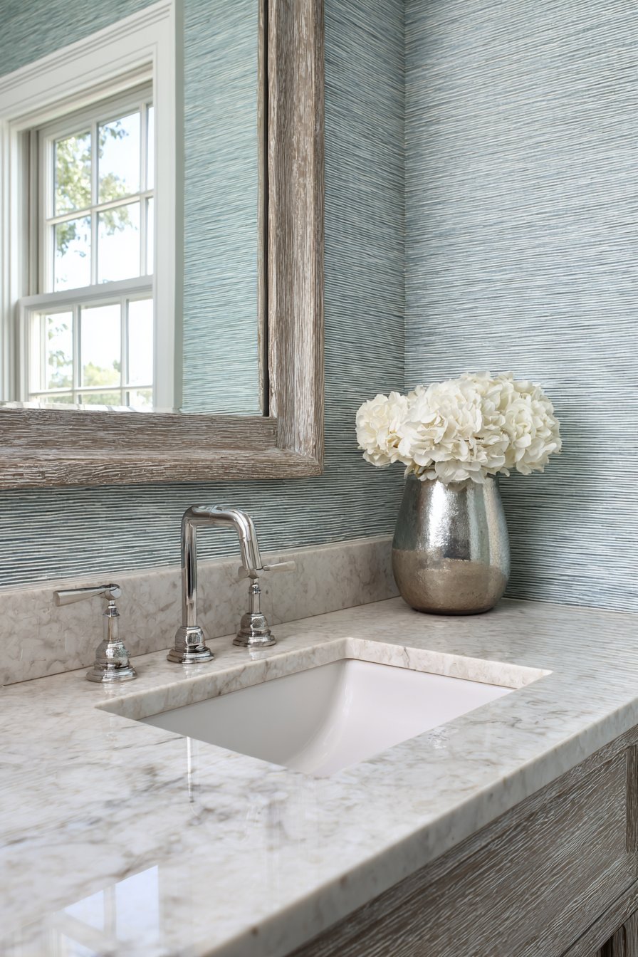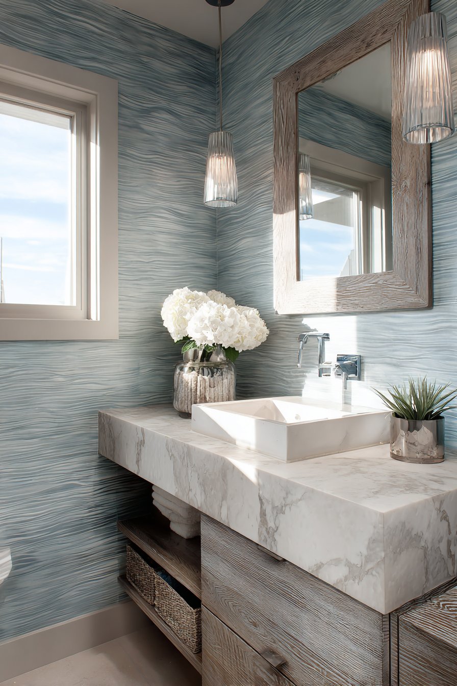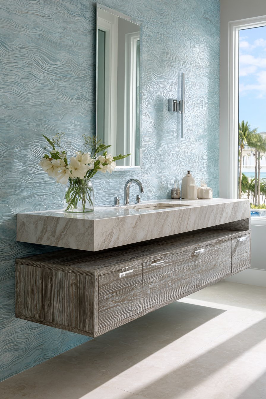 A waterfall faucet in polished chrome adds contemporary sculpture to the functional vanity, its cascading water flow creating a mini water feature that reinforces the ocean theme with literal water movement. The wall behind features textured wallpaper in soft blue-gray depicting gentle ocean waves, adding pattern and visual interest without overwhelming the space. This layered approach—texture on the walls, veining in the stone, grain in the wood—creates depth while maintaining color restraint.