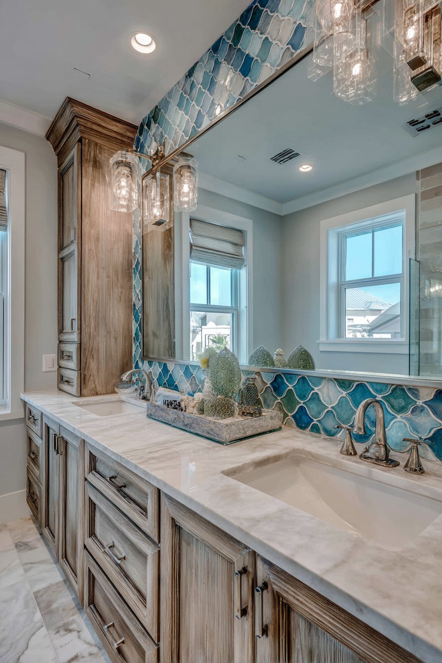Custom cabinetry in driftwood gray stain that reveals natural wood grain patterns anchors this ocean bathroom idea with its double vanity design that provides both function and beauty. The gray stain enhances rather than hides the wood’s character, showing growth rings, knots, and grain variations that make each piece unique. Dual white undermount sinks set in quartz countertops with veining resembling seafoam provide practical work areas while maintaining the ocean color story.
