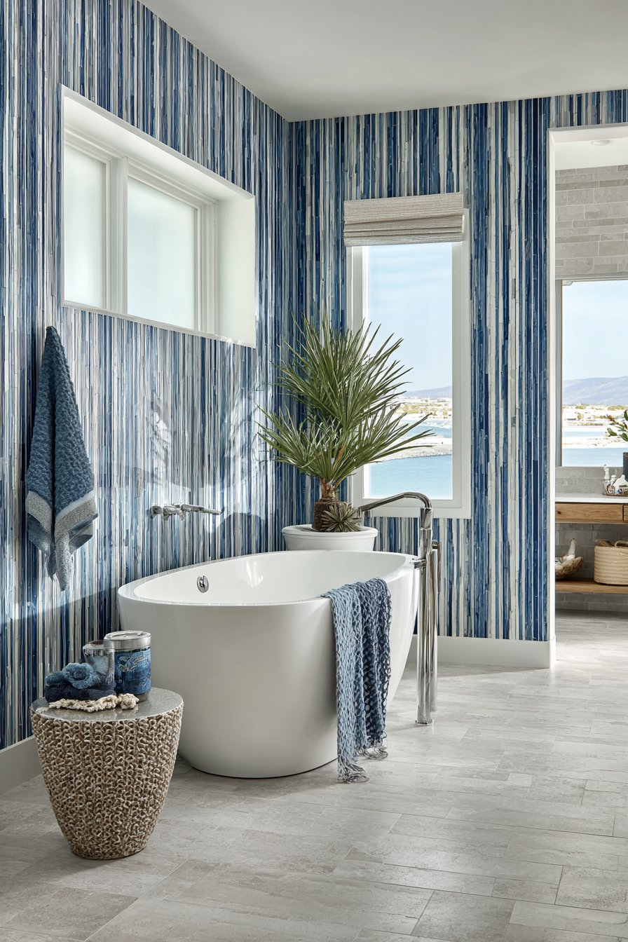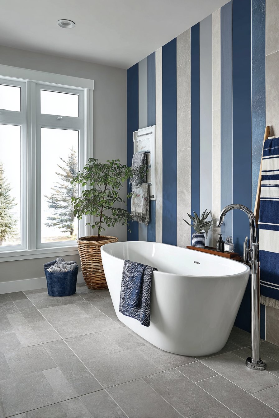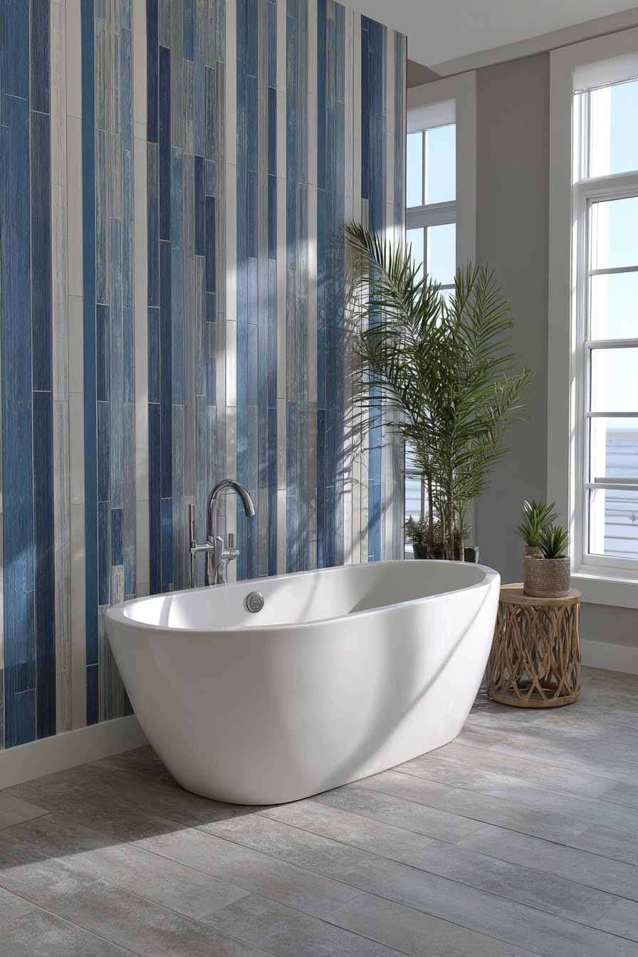 The feature wall behind displays vertical striped tiles alternating between navy, ocean blue, and white, creating a contemporary coastal look that feels fresh and dynamic. The vertical orientation draws eyes upward, making ceilings feel higher while the color striping adds rhythm and movement to an otherwise simple wall plane. The three-color palette creates depth while maintaining cohesion—navy grounds the design, white provides brightness, and the medium ocean blue bridges the two.