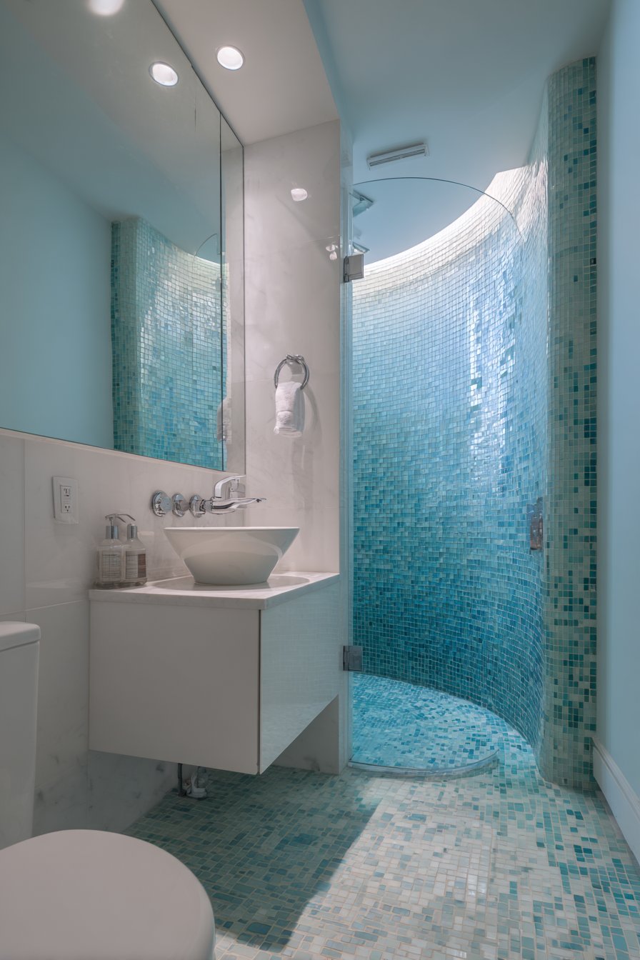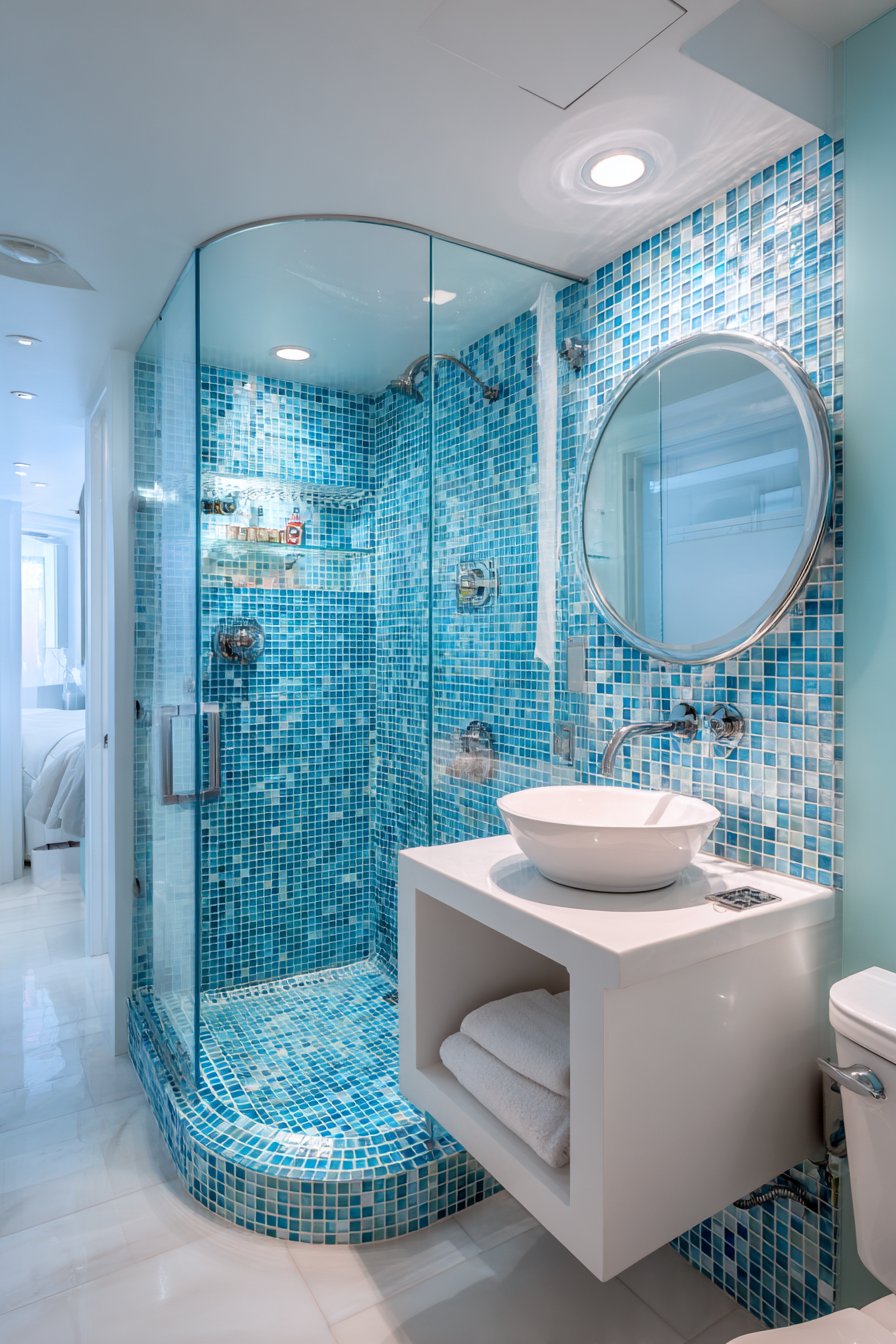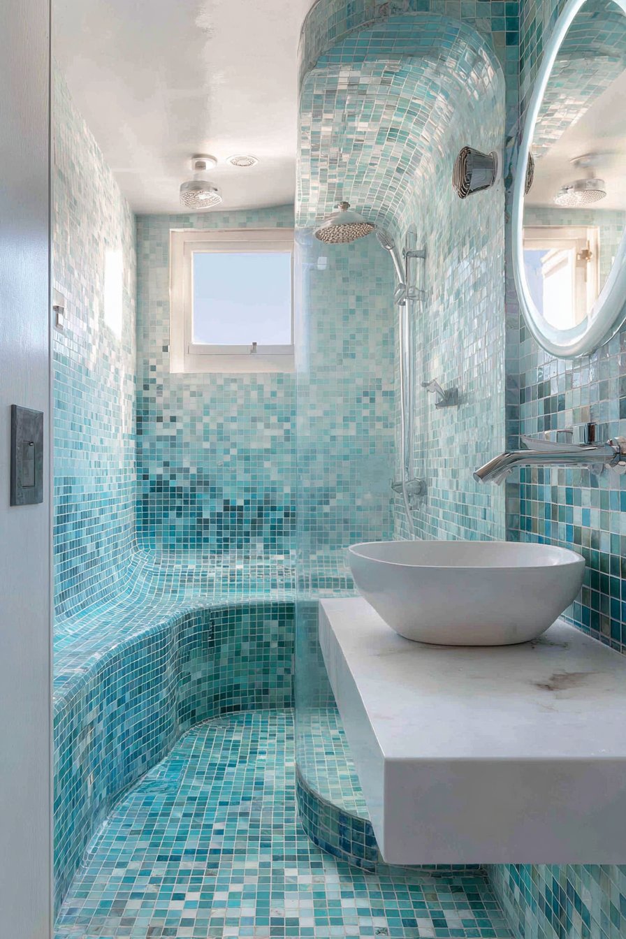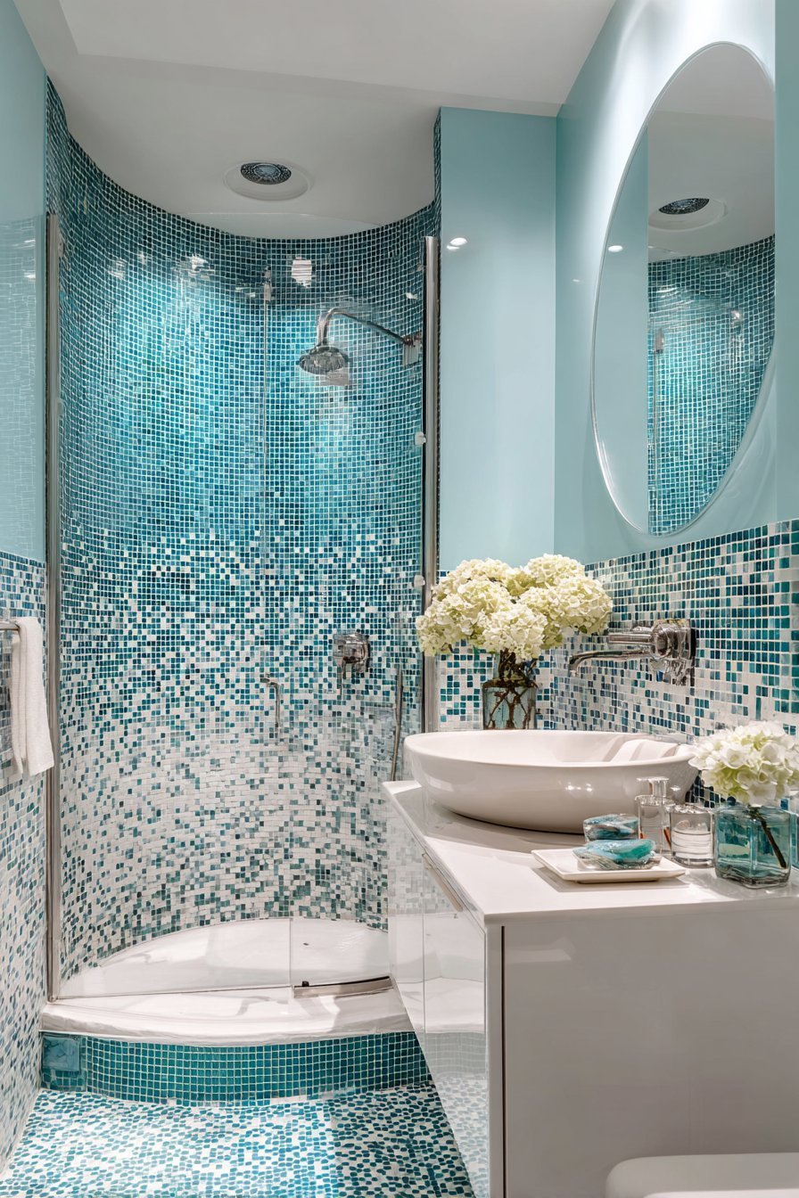 Clever design maximizes impact in this compact ocean bathroom idea with a corner shower featuring curved glass door and walls tiled in small square mosaics creating an ombre effect from white to deep turquoise. The ombre progression transforms the shower into a focal point despite the bathroom’s modest size, proving that spatial constraints need not limit design ambition. The small mosaic tiles allow for smooth color gradation that would be difficult to achieve with larger tiles.