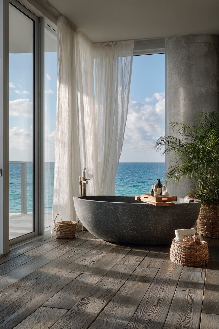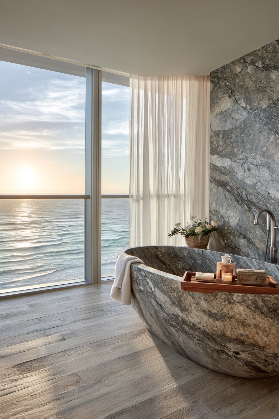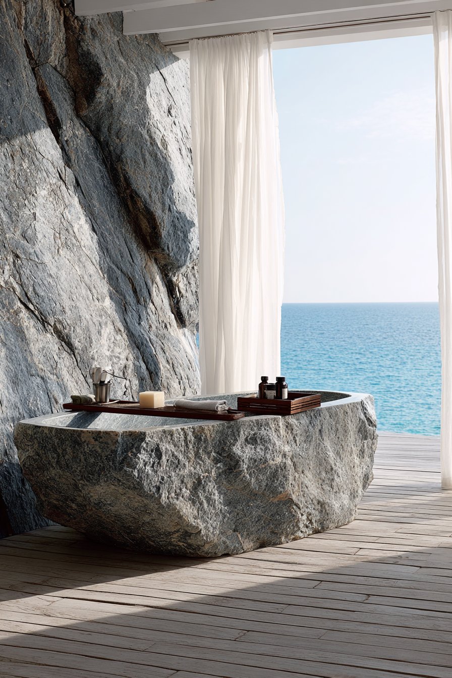 Luxury reaches its zenith in this ocean bathroom idea with a statement soaking tub carved from natural stone in gray-blue tones with visible mineral variations and natural texture. Each stone tub is unique, its color, veining, and texture determined by the specific stone block from which it was carved. The substantial weight and substantial presence create an investment piece that defines the entire bathroom, worthy of prominent placement with a view.