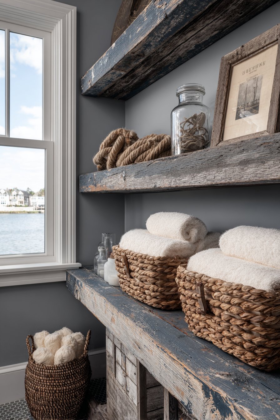 The shelves display white towels, woven baskets, and authentic nautical accessories like rope coils and vintage glass floats, creating a curated collection that feels personal rather than store-bought. Woven baskets provide concealed storage for less attractive necessities while contributing natural texture. The glass floats—originally used on fishing nets—add authentic maritime character with their bubbled glass and weathered rope netting.