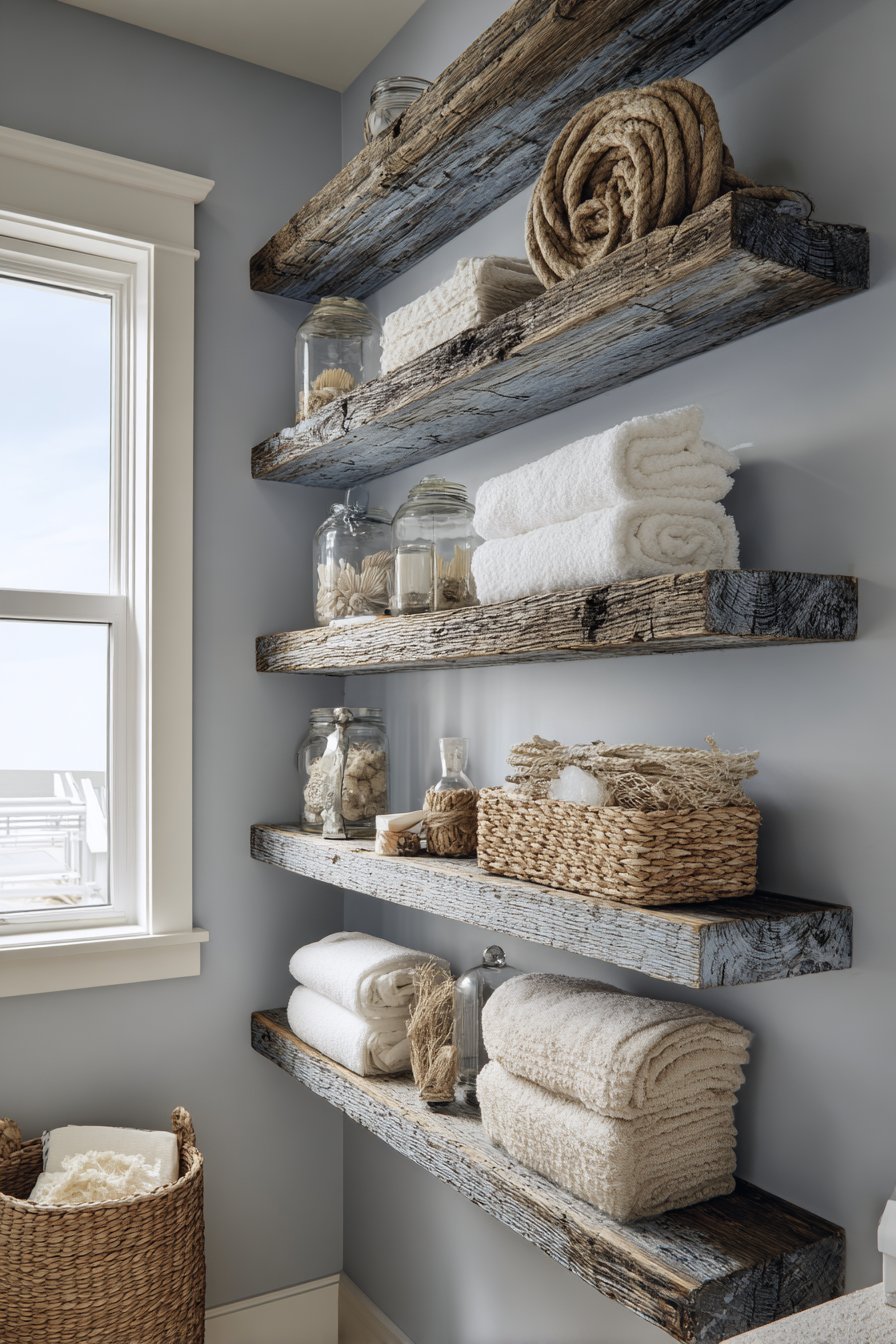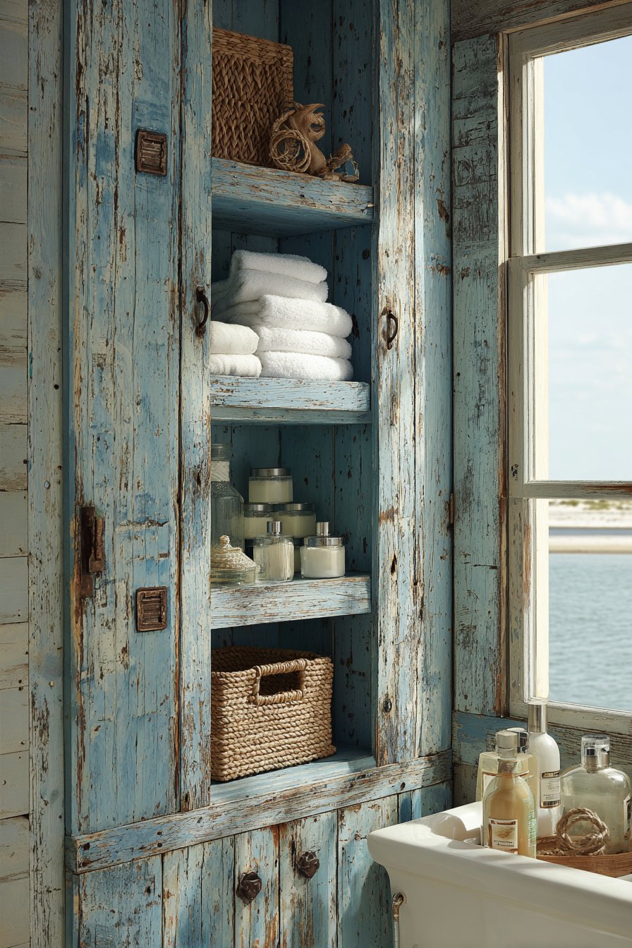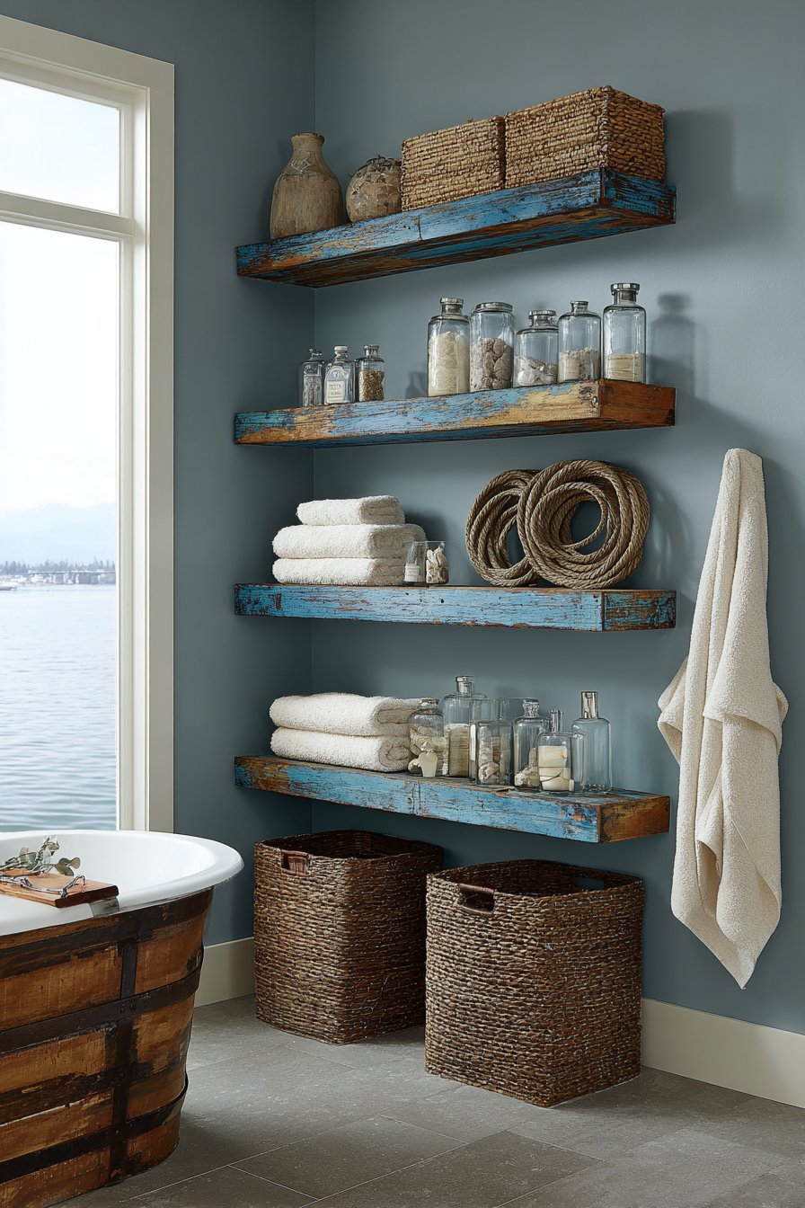 Authenticity and character define this ocean bathroom idea featuring open shelving made from reclaimed boat wood with weathered blue paint showing natural wear patterns. The aged wood tells stories of maritime adventures, its genuine patina impossible to replicate with artificial aging techniques. Paint remnants in various shades of blue create layered interest, revealing different colors as paint has worn away over time—perhaps showing three or four generations of repainting visible simultaneously.