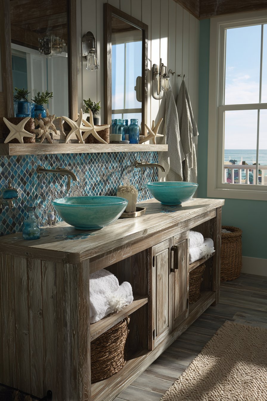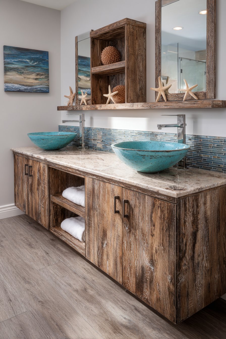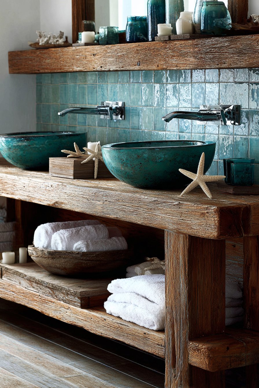 A substantial weathered teak wood double sink cabinet anchors this ocean bathroom idea, bringing the organic beauty of aged maritime materials into a functional centerpiece. The wood’s natural patina, developed over time through exposure to the elements, tells a story of coastal living while providing authentic character that cannot be replicated with new materials. Turquoise blue vessel sinks sit atop this foundation like precious stones discovered along the shoreline, their vibrant color providing a striking focal point against the muted wood tones.