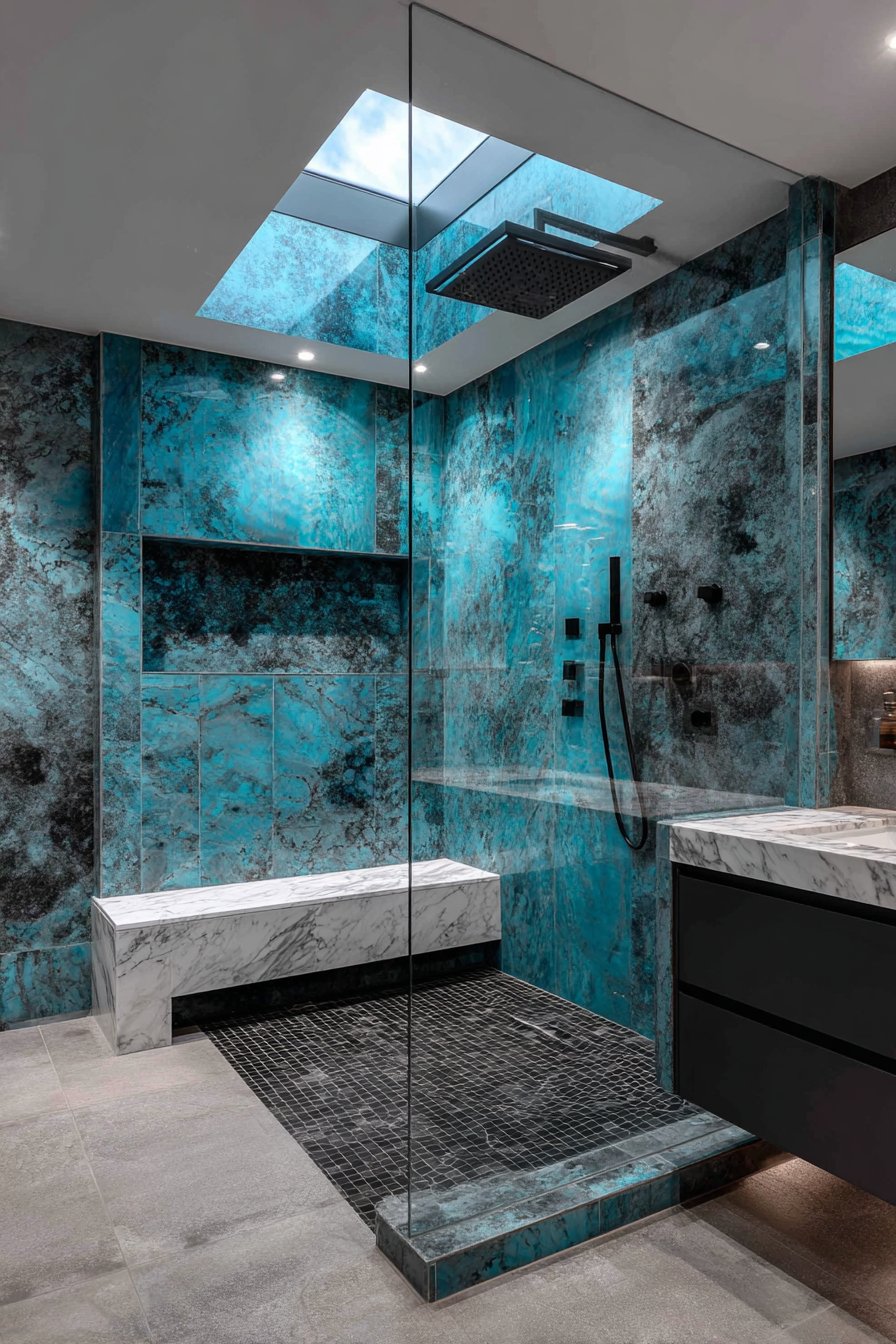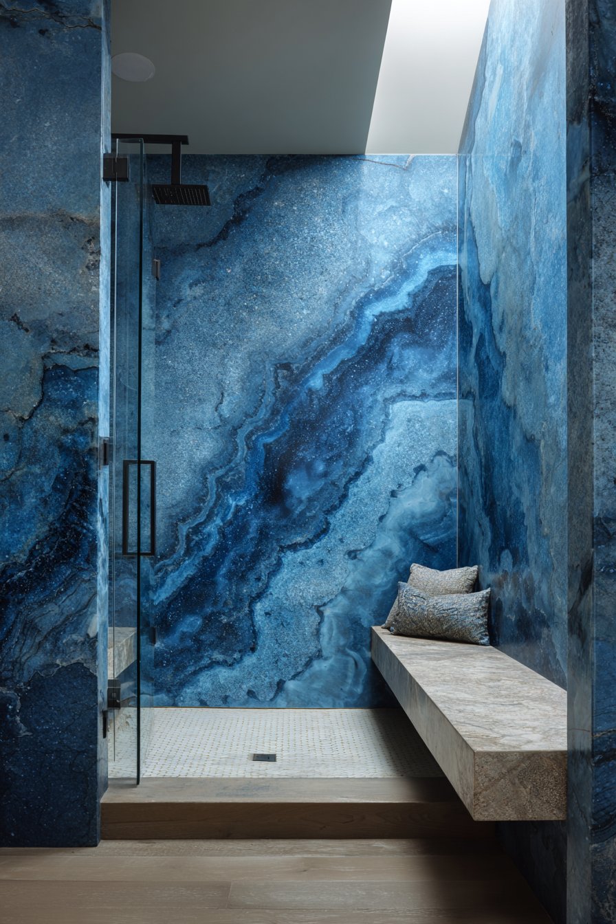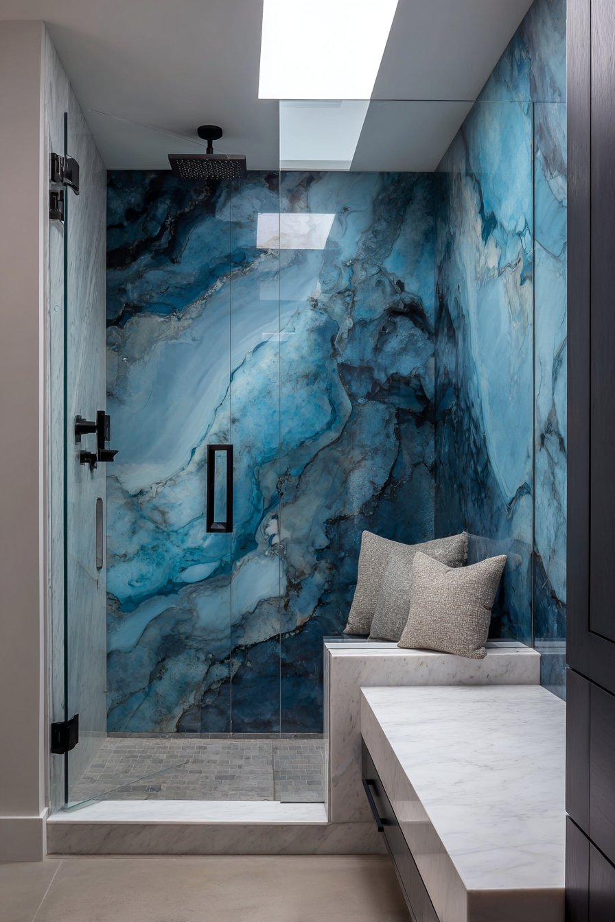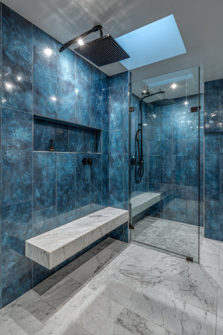 Sophisticated luxury characterizes this contemporary ocean bathroom idea with a walk-in shower featuring a built-in bench tiled in white marble while walls display large format porcelain slabs in deep ocean blue with subtle wave-like veining. The slab format—often 5×10 feet or larger—creates nearly seamless walls with minimal grout lines, producing a clean, architectural aesthetic. The deep blue color makes a bold statement while the subtle veining adds organic movement that prevents the solid color from feeling flat.