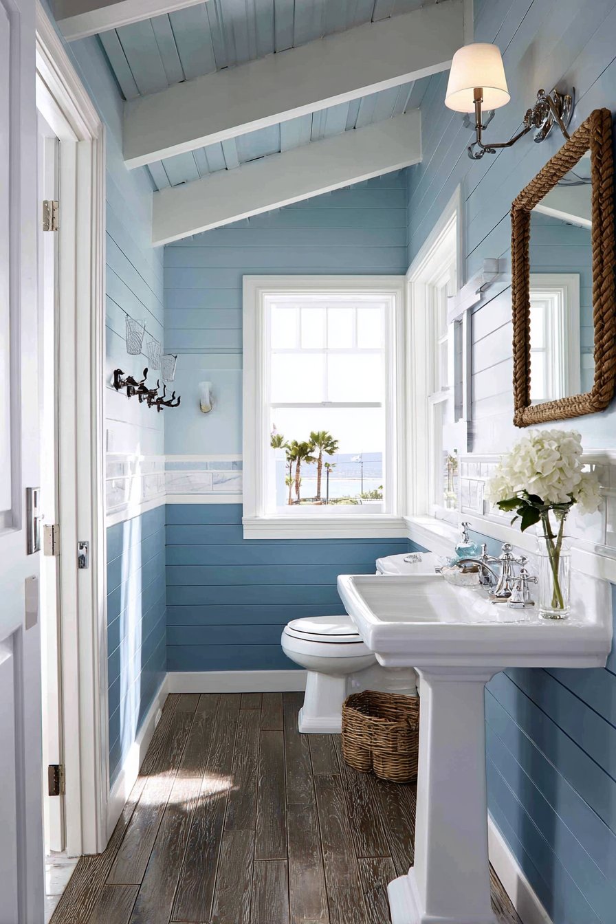 Bold navy blue shiplap walls create dramatic impact in this powder room ocean bathroom idea, proving that small spaces can make big statements. The horizontal lines of the shiplap draw the eye around the room, making the space feel wider while adding textured dimension to the walls. Contrasting white wainscoting at chair-rail height grounds the design and prevents the dark walls from overwhelming the compact space, creating a classic coastal aesthetic that feels both traditional and fresh.