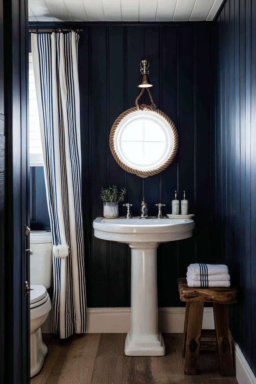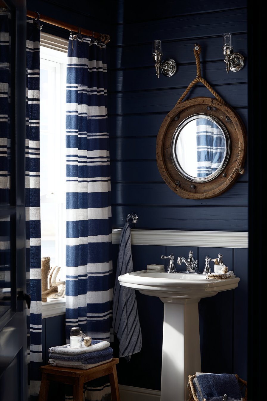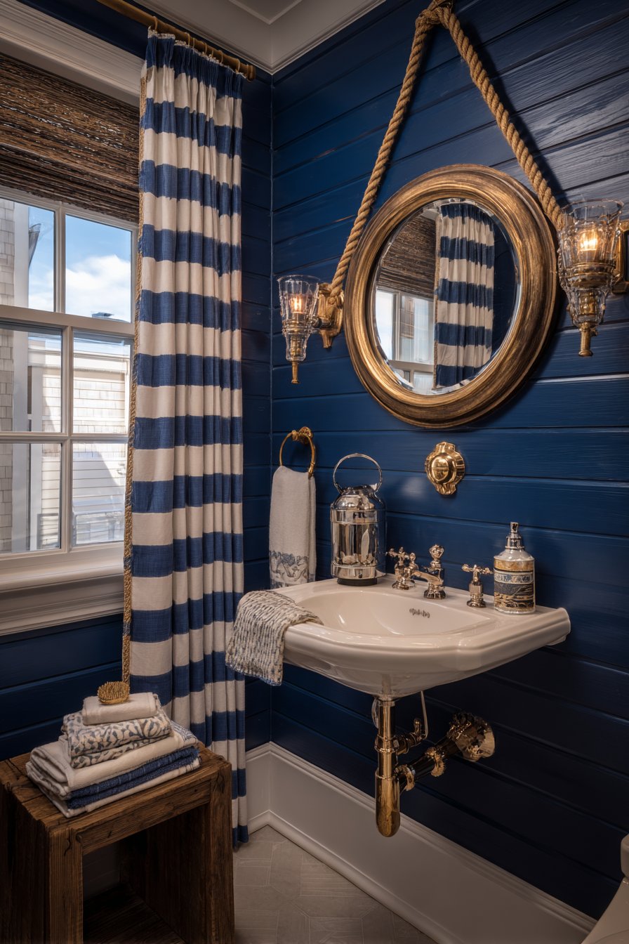 Nautical brass sconce lighting flanking the mirror provides warm illumination while contributing to the maritime theme with subtlety and sophistication. The brass develops a natural patina over time, adding to the authentic coastal character. A striped navy and white curtain filters natural daylight, creating soft, diffused illumination that prevents harsh shadows while reinforcing the color scheme. Every element works together to create a cohesive powder room that feels like a ship’s cabin reimagined for contemporary living.