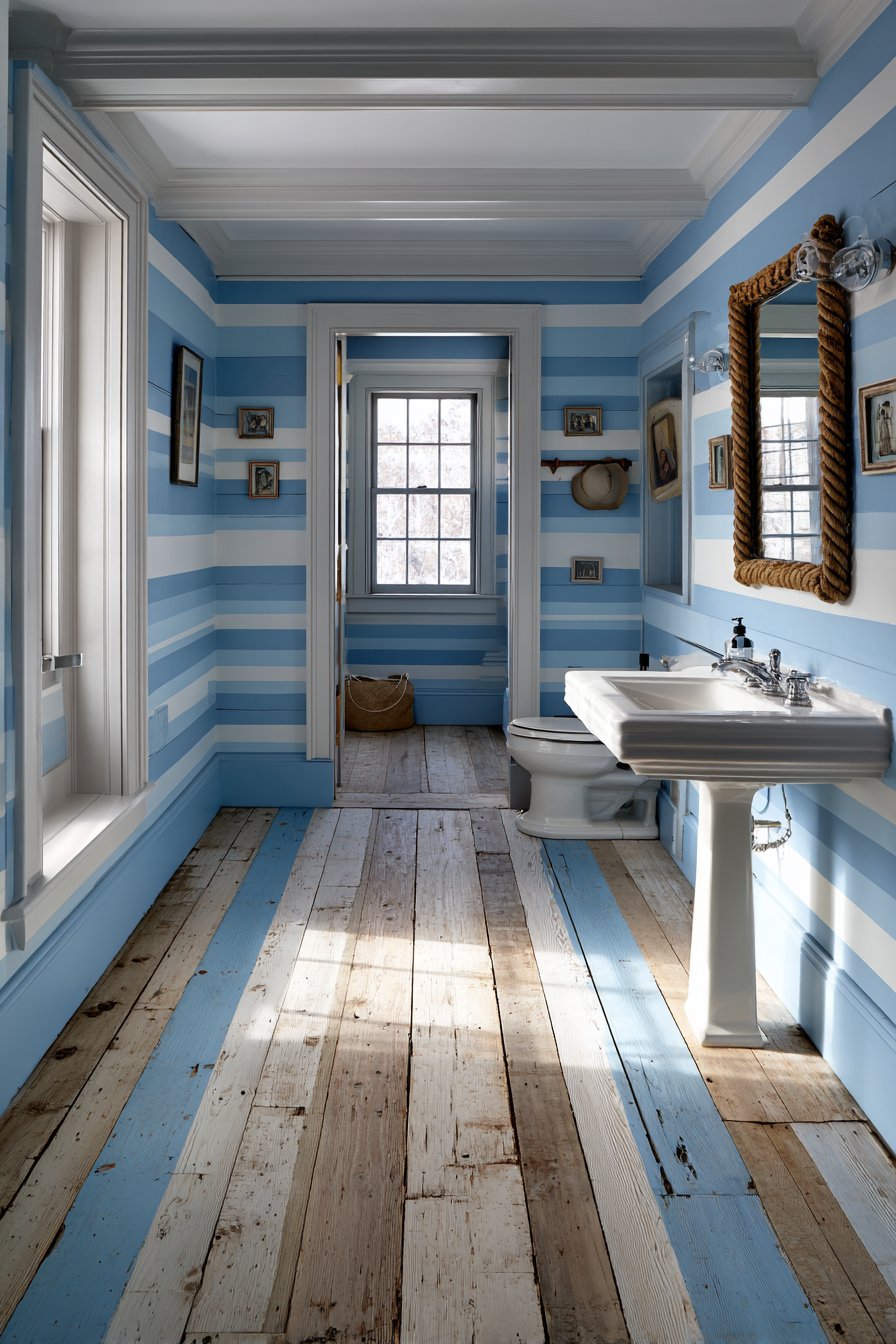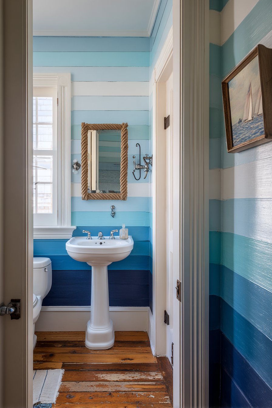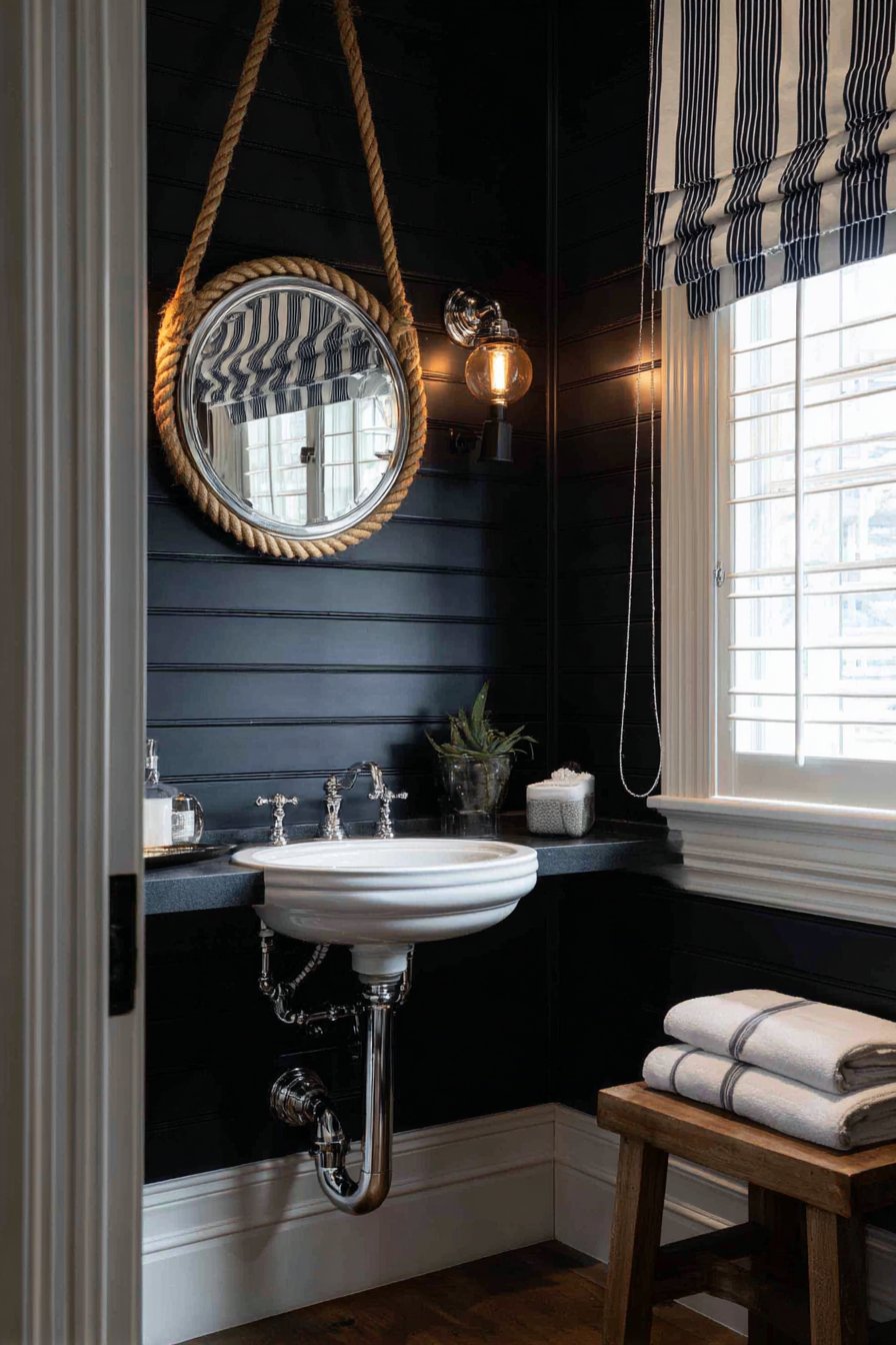 Nautical brass sconce lighting flanking the mirror provides warm illumination while contributing to the maritime theme with subtlety and sophistication. The brass develops a natural patina over time, adding to the authentic coastal character. A striped navy and white curtain filters natural daylight, creating soft, diffused illumination that prevents harsh shadows while reinforcing the color scheme. Every element works together to create a cohesive powder room that feels like a ship’s cabin reimagined for contemporary living.