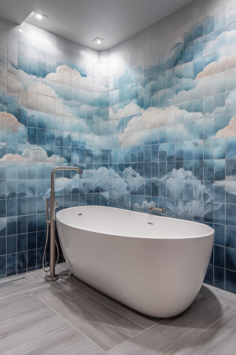 Professional interior photography with balanced natural lighting showcases the artistic tile work while maintaining realistic material representation and livable space proportions. The lighting should emphasize the tile colors and dimensional quality without creating harsh shadows or blown-out highlights. This balance ensures the photography captures the space’s atmosphere—artistic yet livable, ambitious yet achievable.