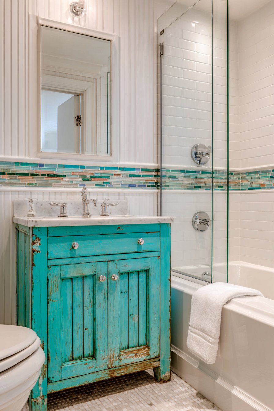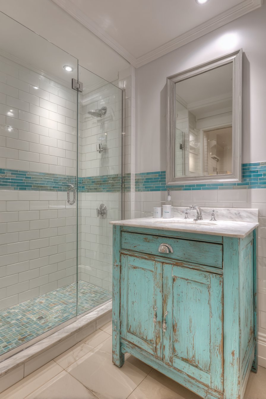 The vanity is a painted wood piece in weathered turquoise with white marble top and chrome hardware showing authentic paint texture and slight distressing. The painted furniture approach creates character while remaining budget-friendly compared to custom cabinetry, making quality ocean bathroom design accessible to average homeowners. The turquoise paint color brings personality while the marble top adds durability and easy-care functionality essential for family bathrooms.