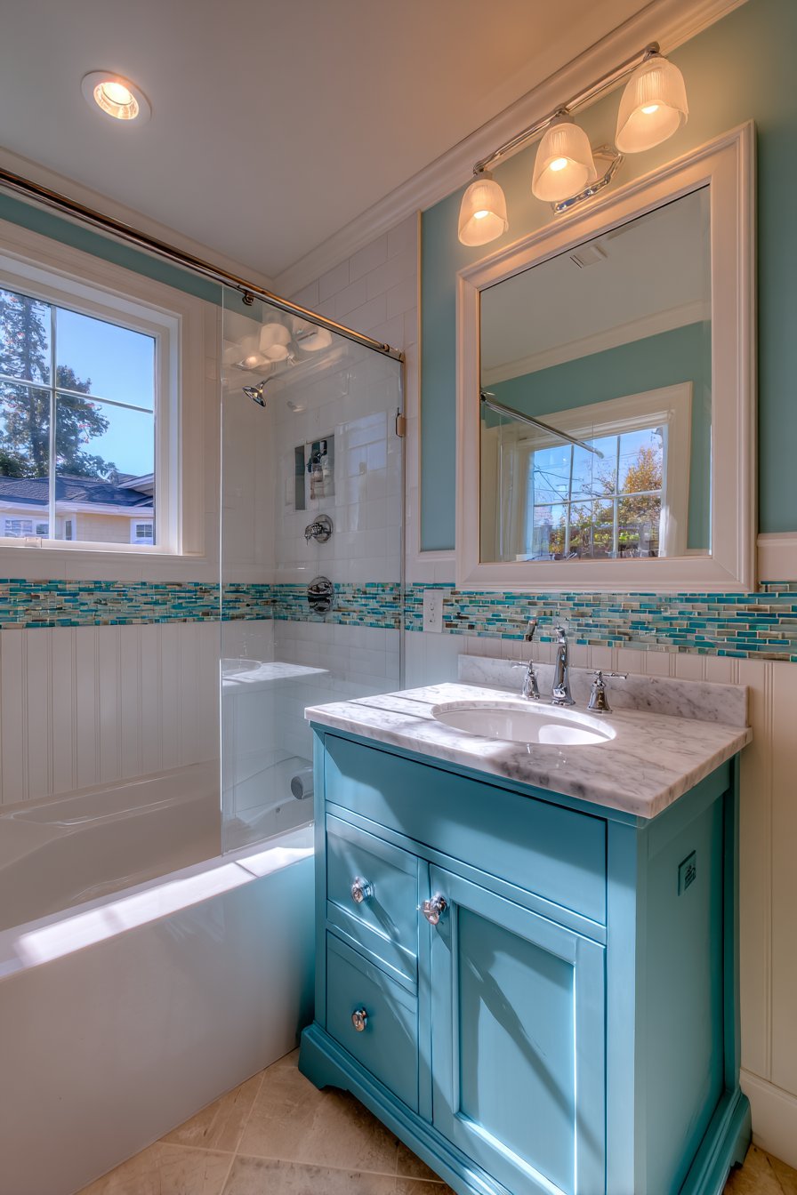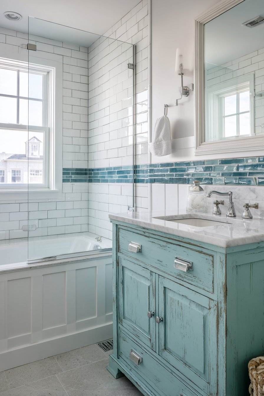 Accessible coastal style characterizes this practical ocean bathroom idea family bath with a tub-shower combination featuring a glass tile accent strip in mixed ocean blues and greens running horizontally at eye level through white subway tile walls. The accent strip breaks up the white subway tile expanse while adding ocean color in a manageable dose—enough to establish the theme without overwhelming the practical family bathroom. The glass tiles catch light beautifully, creating sparkle and interest that solid tiles cannot match.