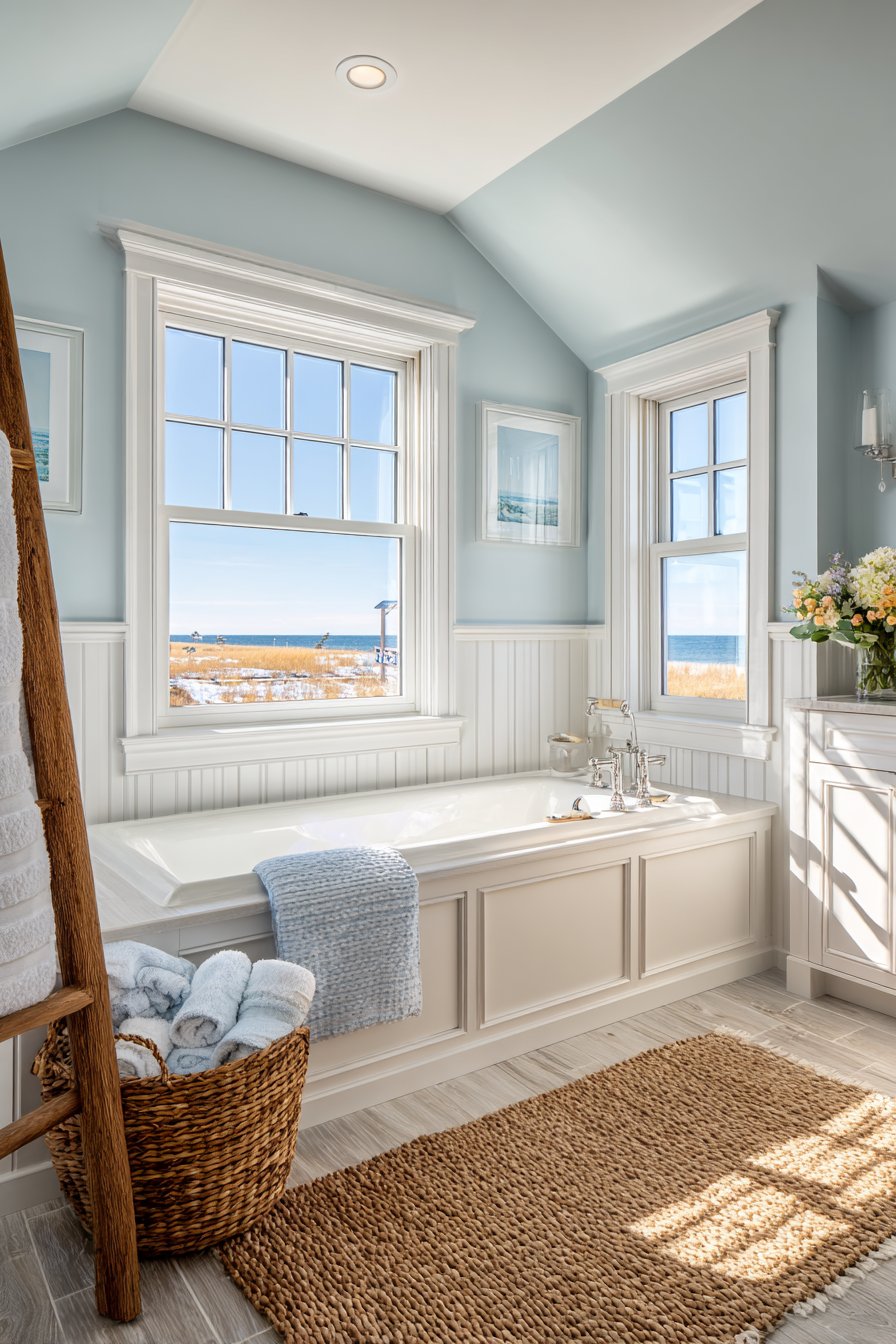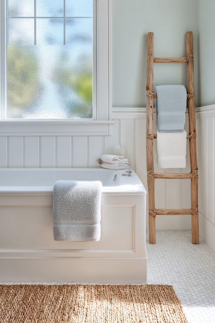 White beadboard wainscoting provides textured contrast while reinforcing coastal cottage charm, its vertical lines drawing the eye upward and making the ceiling feel higher. A wooden ladder repurposed as towel storage adds rustic appeal while solving the practical challenge of towel placement near the tub. The ladder should show authentic wear—not artificial distressing—with plush white and light blue towels draped over its rungs like sails catching the breeze.