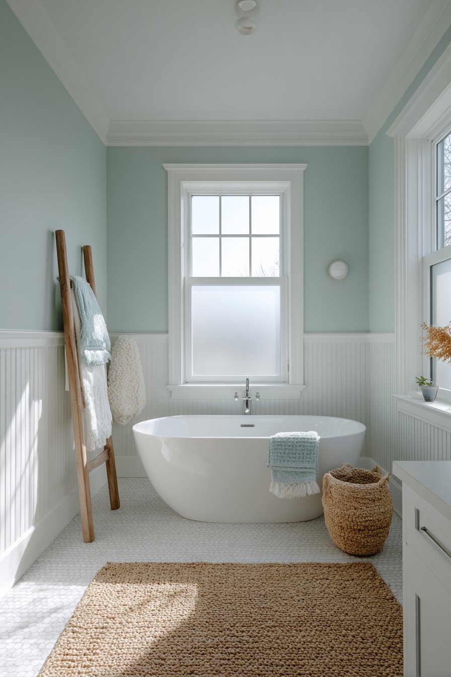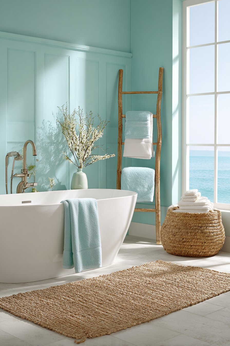 Soft seafoam walls with subtle color variation create a cocoon of calm in this ocean bathroom idea centered around a deep soaking tub positioned to maximize natural light. The paint application technique is crucial here—slight variations in color density across the walls mimic the way light plays on water, adding depth and preventing the flat appearance that single-coat paint jobs produce. This approach transforms plain walls into an atmospheric backdrop that changes throughout the day as natural light shifts.