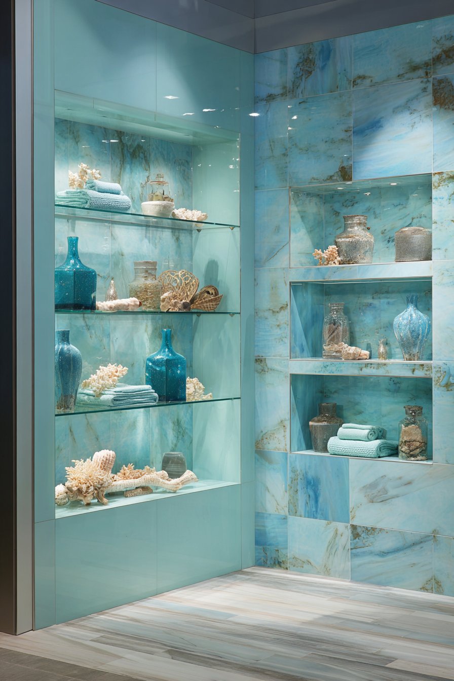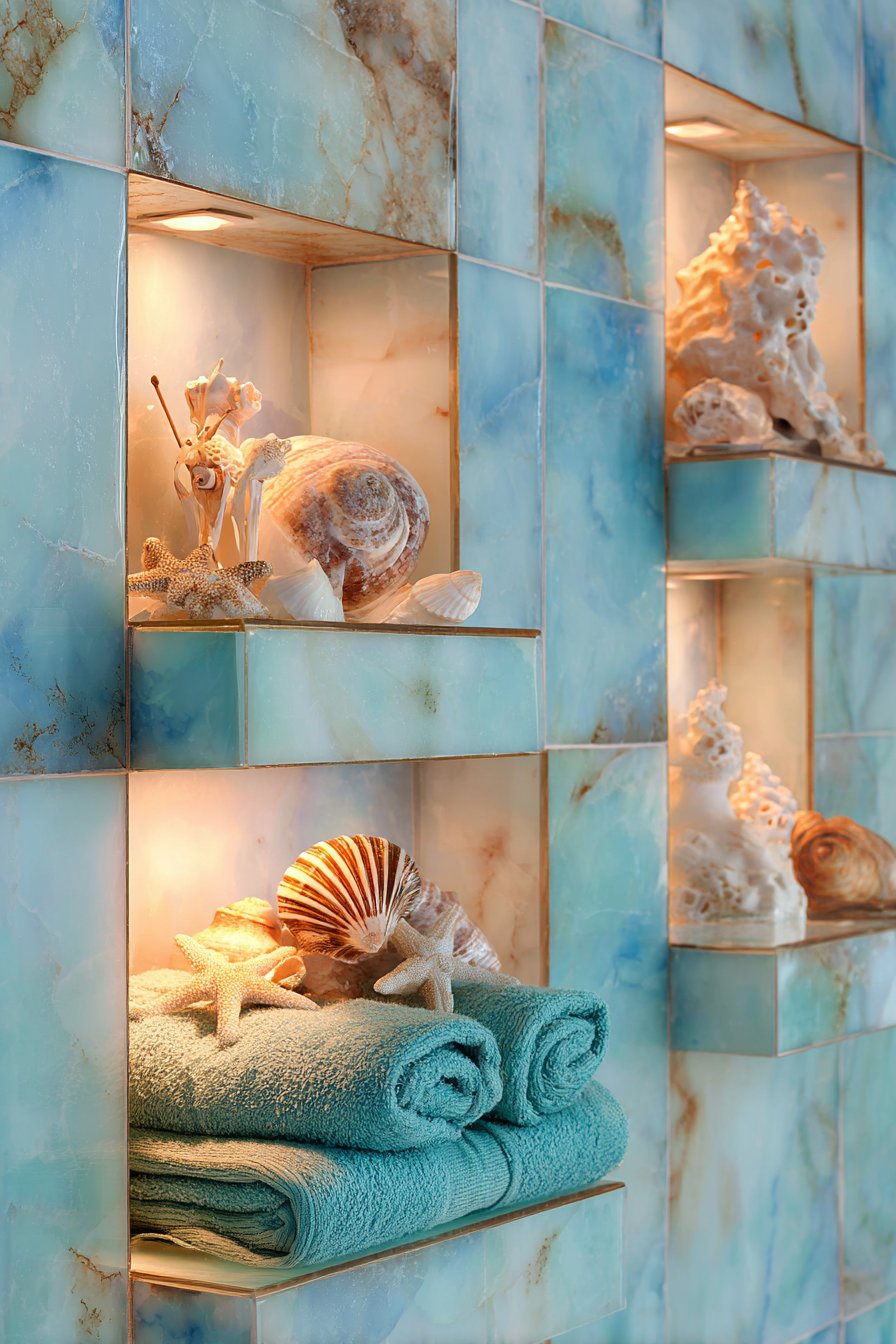 Each niche features integrated LED strip lighting that transforms utilitarian storage into illuminated showcases, highlighting curated coastal accessories with gallery-like precision. The lighting should be warm-toned rather than cool to prevent the blue-green tiles from feeling cold or institutional. Careful curation is essential—each niche should tell a small story with shells, coral, sea glass, and other authentic coastal finds arranged with artistic intention rather than cluttered randomness.