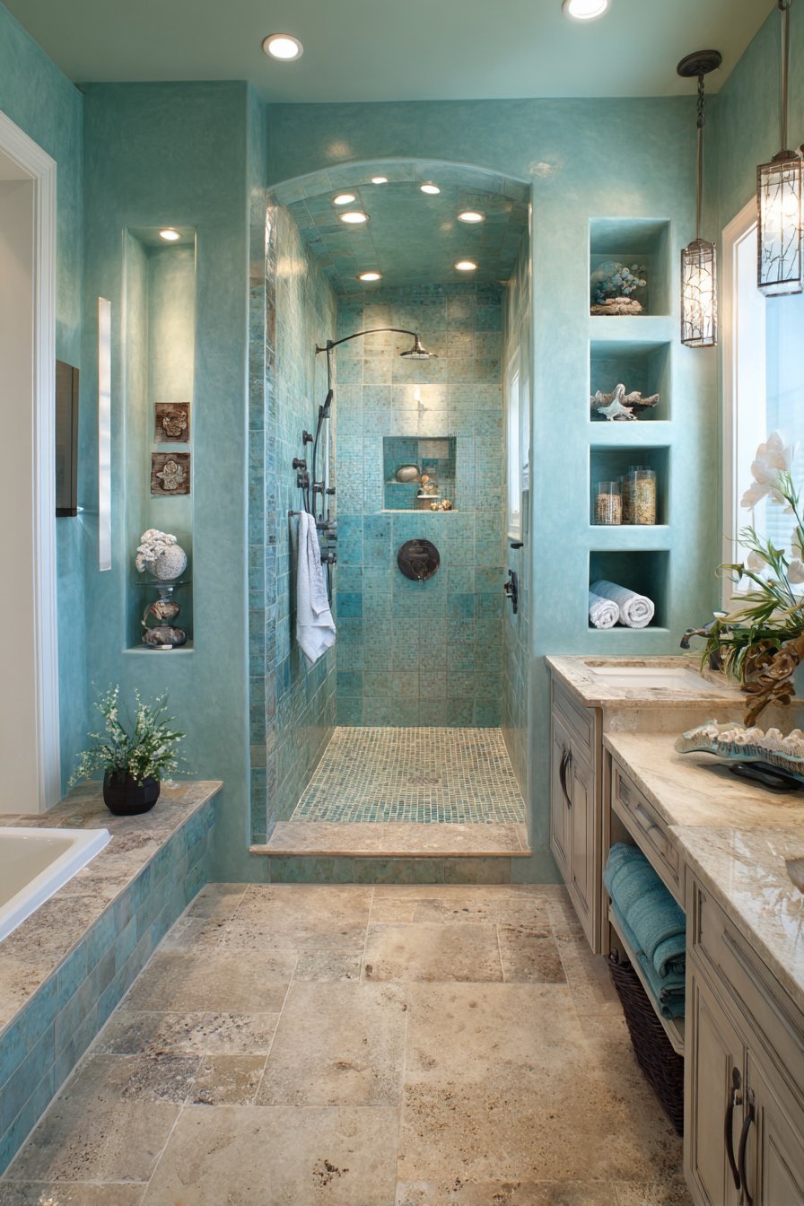 This ocean bathroom idea focuses on storage solutions that double as display opportunities, with built-in wall niches providing homes for beach-collected items and neatly rolled towels in ocean-inspired colors. The surrounding walls feature large format porcelain tiles in pale aquamarine with natural stone-like texture variations, their substantial size creating a clean, modern backdrop that makes the niche displays pop. These tiles offer the beauty of natural stone with the practical benefits of porcelain—easier maintenance and consistent quality.