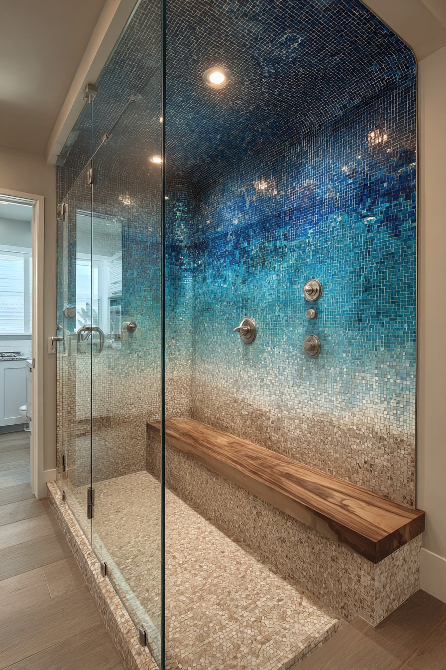 Luxury meets artistry in this ocean bathroom idea featuring a glass-enclosed steam shower with mosaic tiles creating an underwater scene that gradually transitions from sandy beige at the bottom to deep ocean blue at the top. This ambitious tile installation transforms the shower into an immersive experience, making you feel submerged in the ocean every time you step inside. The gradient requires careful planning and skilled installation, with thousands of small tiles precisely placed to create smooth color transitions that mimic the natural progression of ocean depth.