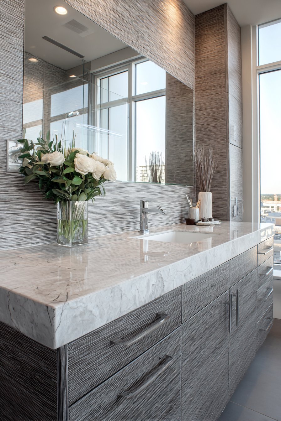 Chrome fixtures and a large frameless mirror complete the functional design with contemporary simplicity, letting the elaborate tile work and custom cabinetry provide all the visual interest needed. The mirror’s lack of frame creates clean lines while reflecting light throughout the space, making the bathroom feel larger and brighter. Natural window light highlights the varied textures—smooth quartz, dimensional tile, grainy wood—and practical storage solutions tucked within the custom cabinetry.