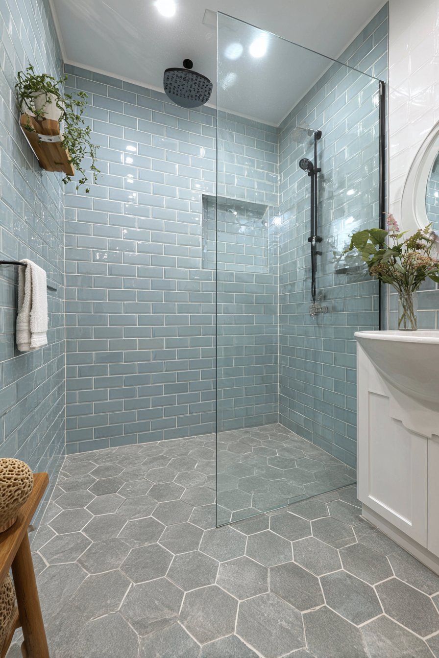 Practicality meets coastal style in this ocean bathroom idea designed for family use, with subway tiles in glacial blue arranged in classic brick pattern covering shower walls. The subway tile format is inherently family-friendly—easy to clean, durable, and timeless—while the blue color elevates it beyond basic white. White grout lines create clear definition between tiles while keeping the overall appearance light and airy, preventing the blue from feeling too heavy or dark.