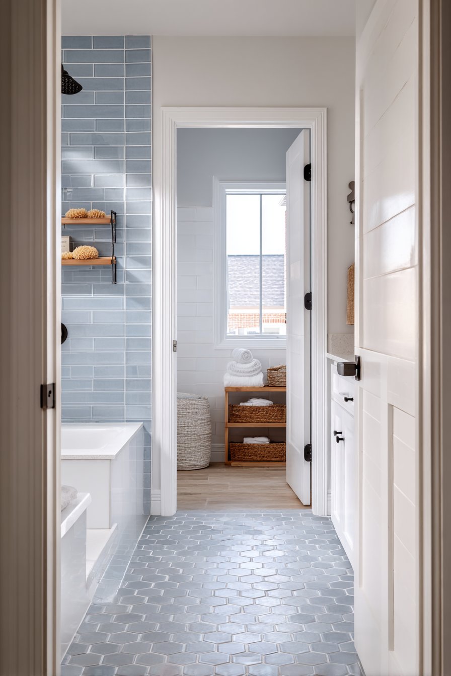 Gray-blue hexagonal porcelain tiles on the floor tie the design together with geometric interest and slight tonal variation that hides everyday wear better than solid colors. The hexagonal shape adds visual appeal while the porcelain material provides durability for high-traffic family use. Natural daylight streaming through a window emphasizes the clean, functional design while keeping the space from feeling cave-like despite the blue color saturation.