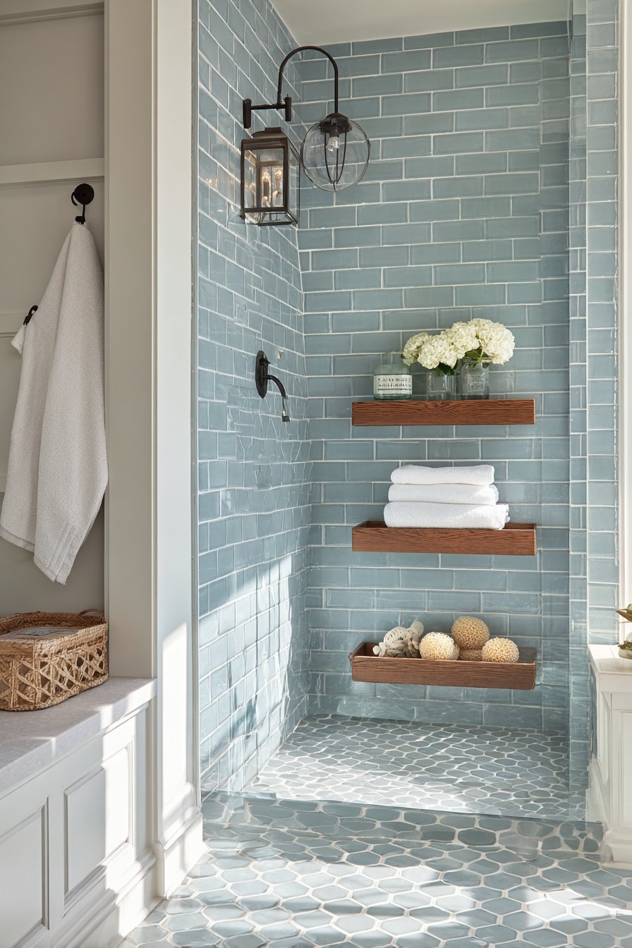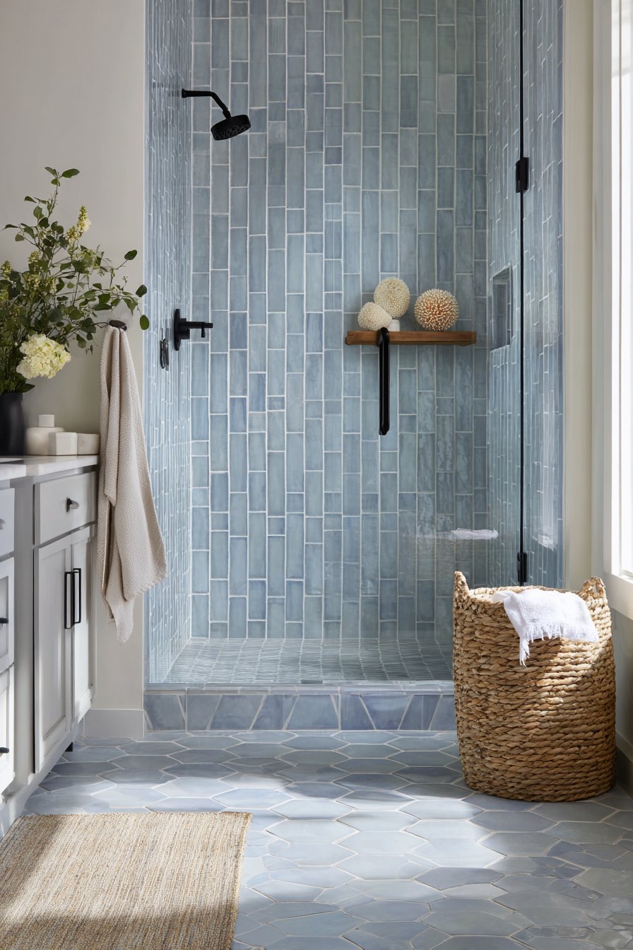 Matte black fixtures provide contemporary contrast that grounds the cool blue tiles and prevents the space from feeling too sweet or traditional. This bold hardware choice adds modern edge while remaining practical—matte finishes show water spots less readily than shiny chrome or brushed nickel. A teak shower caddy and natural sea sponges introduce organic coastal elements that soften the hard surfaces while serving genuine functional needs.