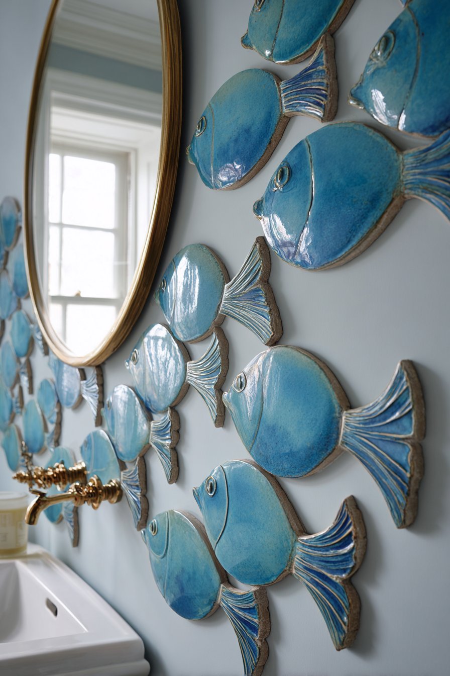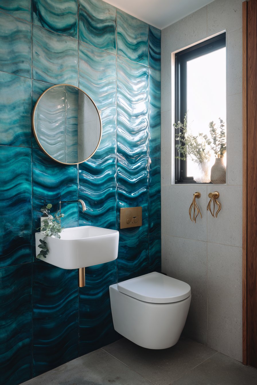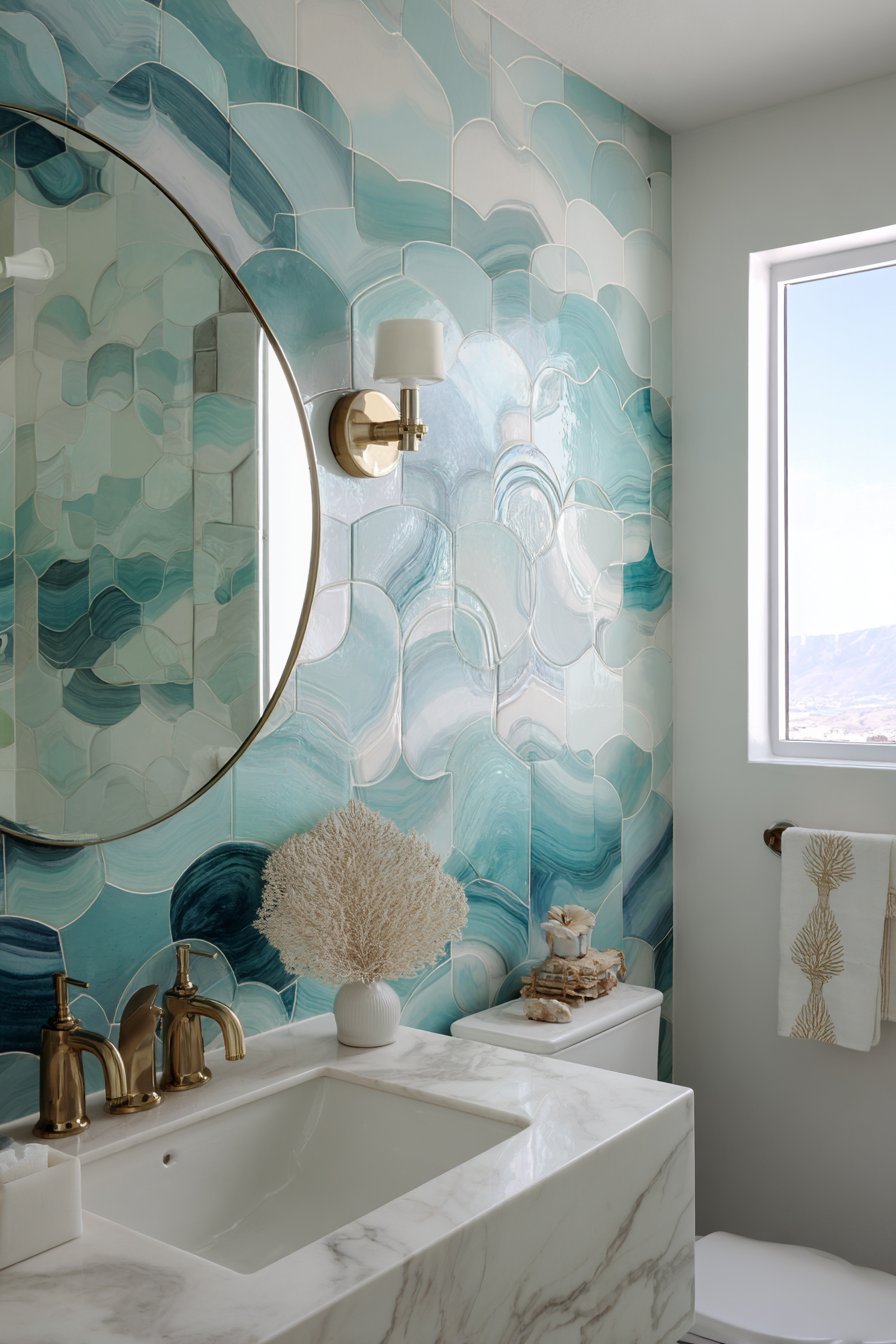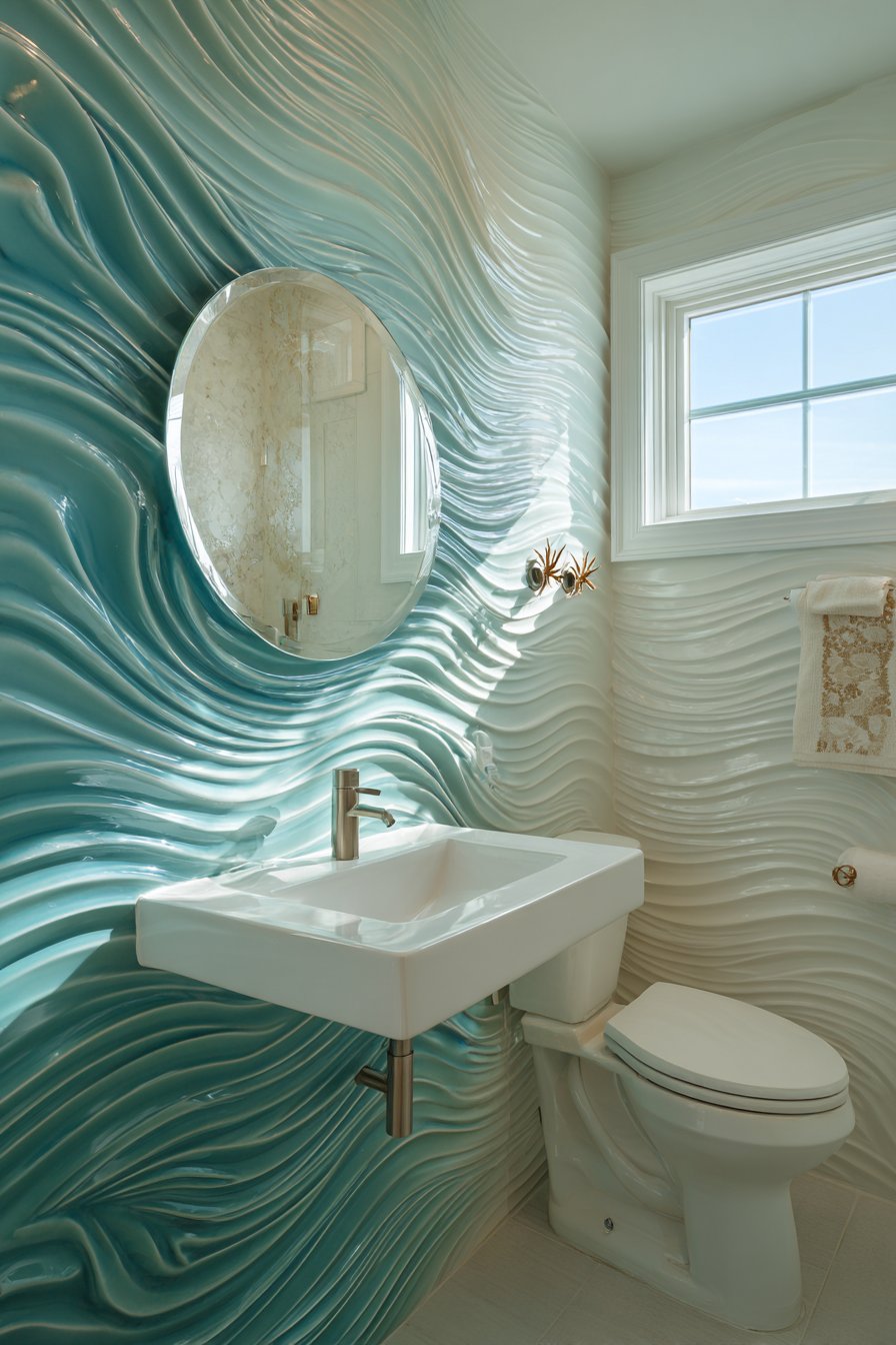 A compact powder room makes maximum impact with this ocean bathroom idea featuring a statement wall of three-dimensional wave-pattern tiles in graduating shades of turquoise and teal. These sculptural tiles create dramatic shadows and highlights that change throughout the day as light moves across their undulating surfaces. The tactile quality invites touch while the visual drama ensures guests remember this small space. The installation requires careful planning to align the wave patterns properly and create the intended flowing effect.