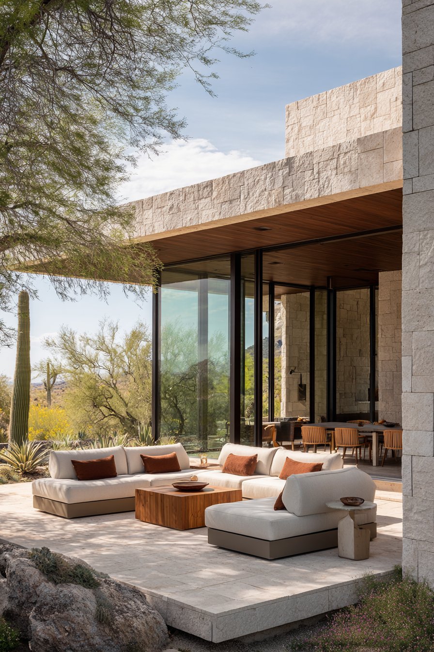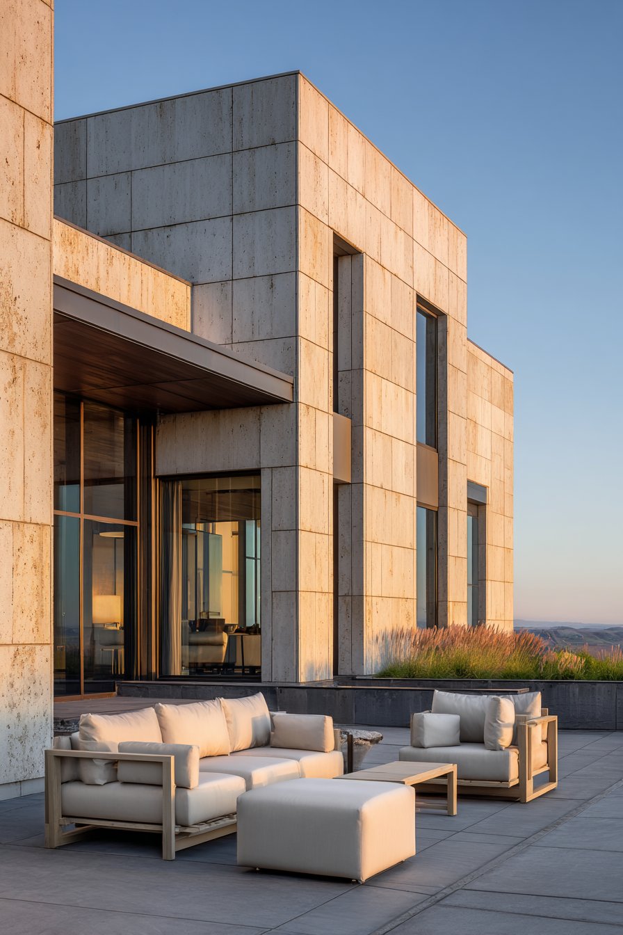 1. Modern Travertine-Inspired Patio Elegance