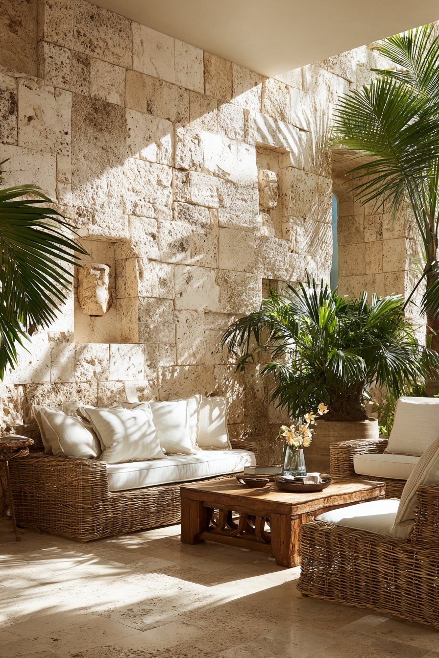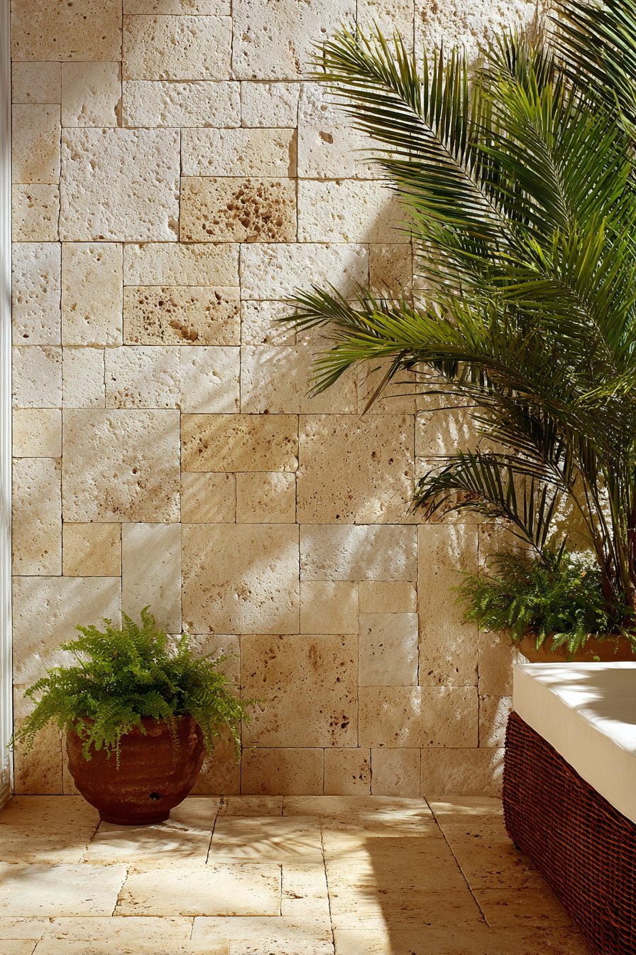 Pair coral stone walls with oversized palm plants in terracotta containers and natural rattan furniture to complete the resort-inspired aesthetic. The stone’s neutral palette serves as the perfect backdrop for the deep greens of tropical foliage and the vibrant colors of flowering plants like hibiscus, bird of paradise, or bougainvillea. Dappled sunlight filtering through palm fronds creates ever-changing patterns on the stone surface, enhancing the sense of tropical sanctuary. The porous nature of coral stone provides excellent drainage, making it particularly suitable for poolside applications or areas exposed to rain.