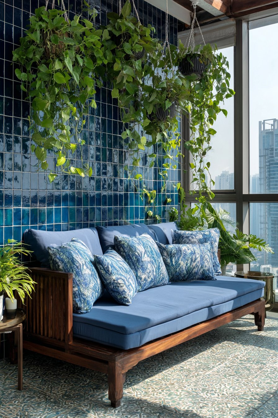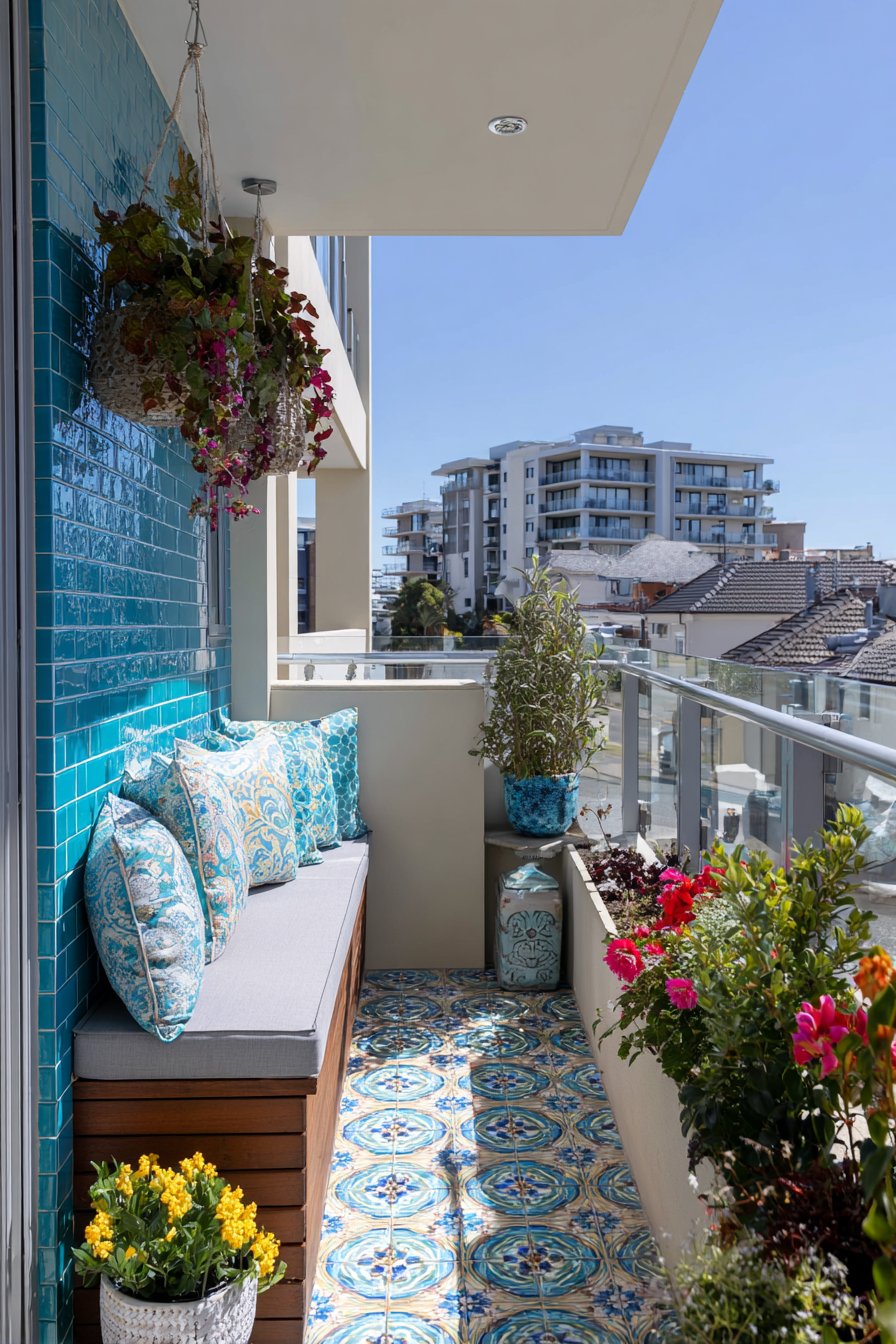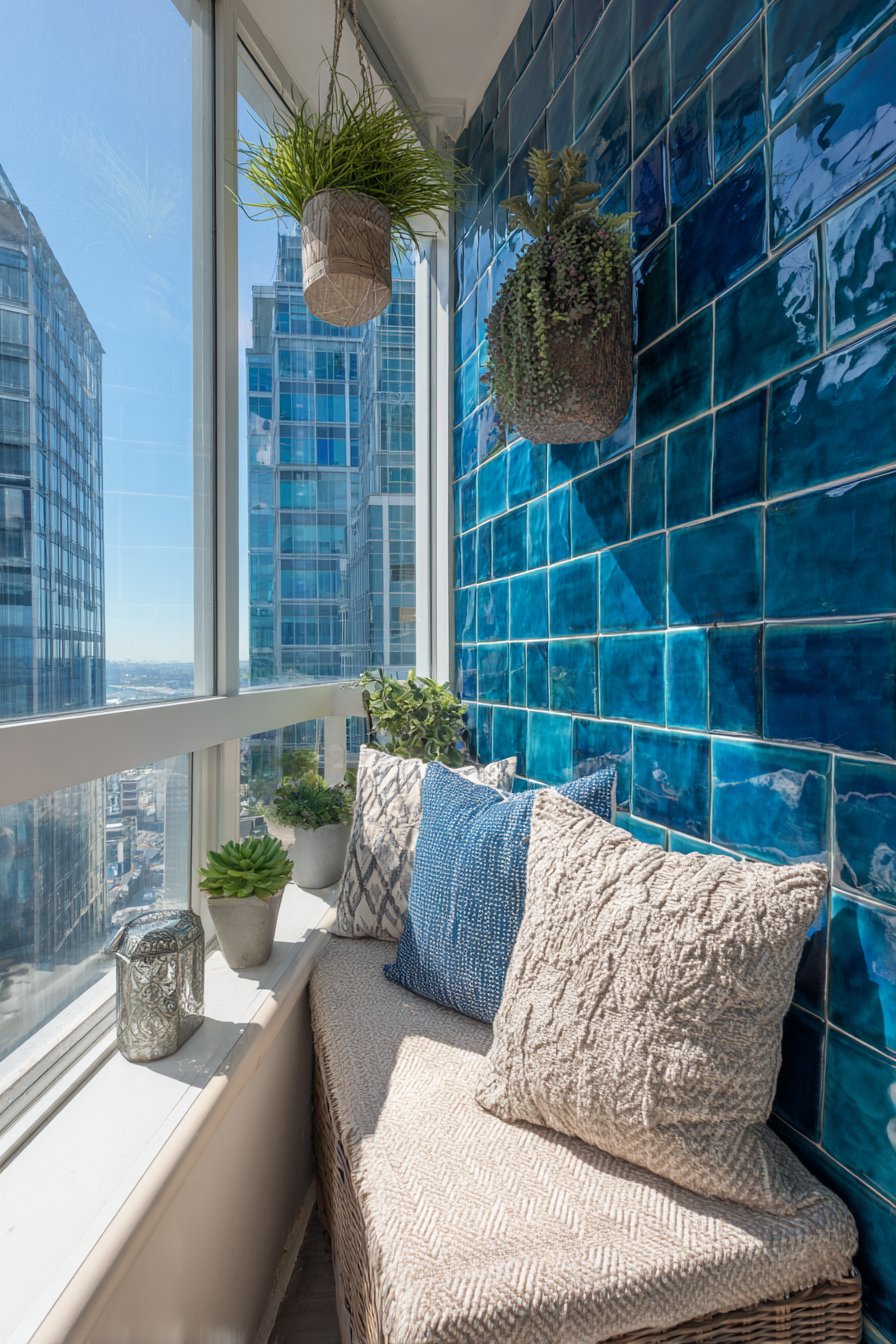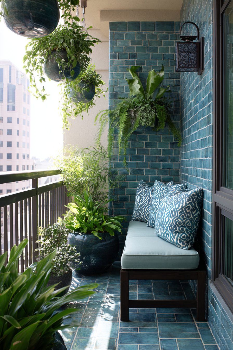Furnish teal-tiled balconies with simple, space-efficient pieces like narrow benches with weatherproof cushions and vertical hanging planters that don’t consume precious floor space. The bold backdrop allows furnishings to remain minimal and neutral, with the wall providing all the color and personality the space requires. Evening lighting creates magical effects as the glossy tiles reflect string lights or lanterns, turning the small balcony into an illuminated retreat perfect for unwinding after urban workdays.