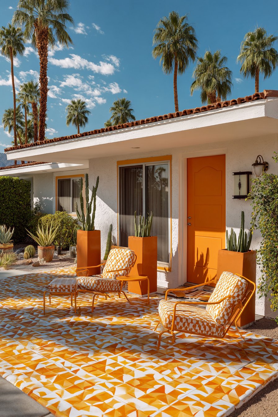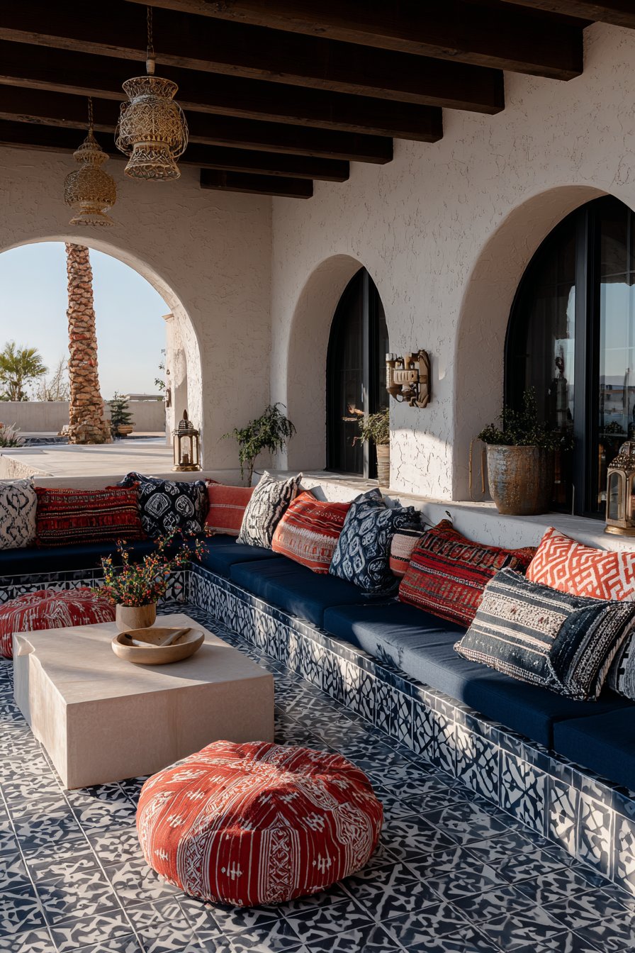 Cement tiles offer unique advantages for outdoor use, including superior durability and slip resistance. Unlike ceramic or porcelain alternatives, cement tiles develop character over time, with gentle patina adding to their appeal rather than detracting from it. The matte finish prevents glare while maintaining color vibrancy, and the material’s natural porosity allows it to shed water effectively. Pair these striking tiles with simple, modern furniture in neutral tones to prevent visual competition between pattern and furnishings.