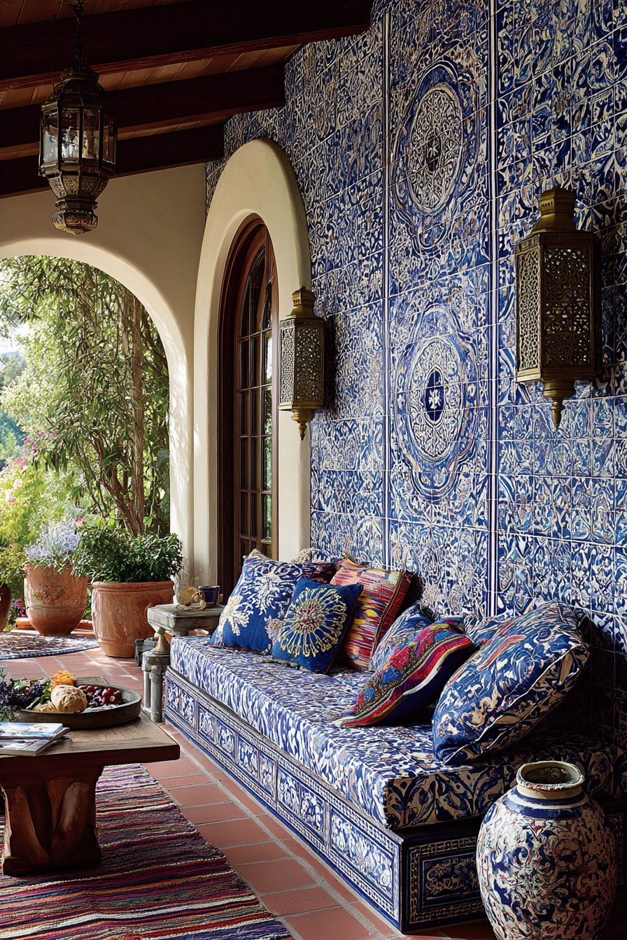 Furnish bohemian tiled spaces with an intentional mix of seating types—perhaps a vintage rattan peacock chair, floor cushions in global textiles, and a weathered wooden bench. Add hanging plants in macramé holders, colorful Moroccan lanterns, and an array of potted plants in mismatched containers. The resulting space feels personal, artistic, and welcoming, with the patterned tile wall serving as the foundation for layers of texture, color, and self-expression.