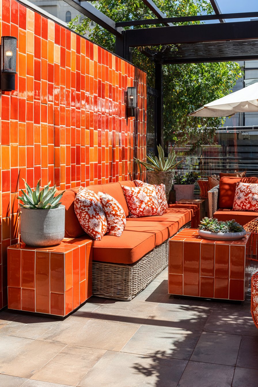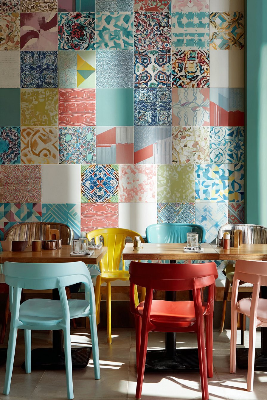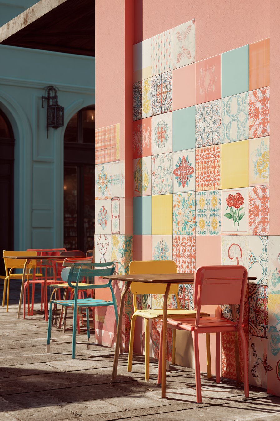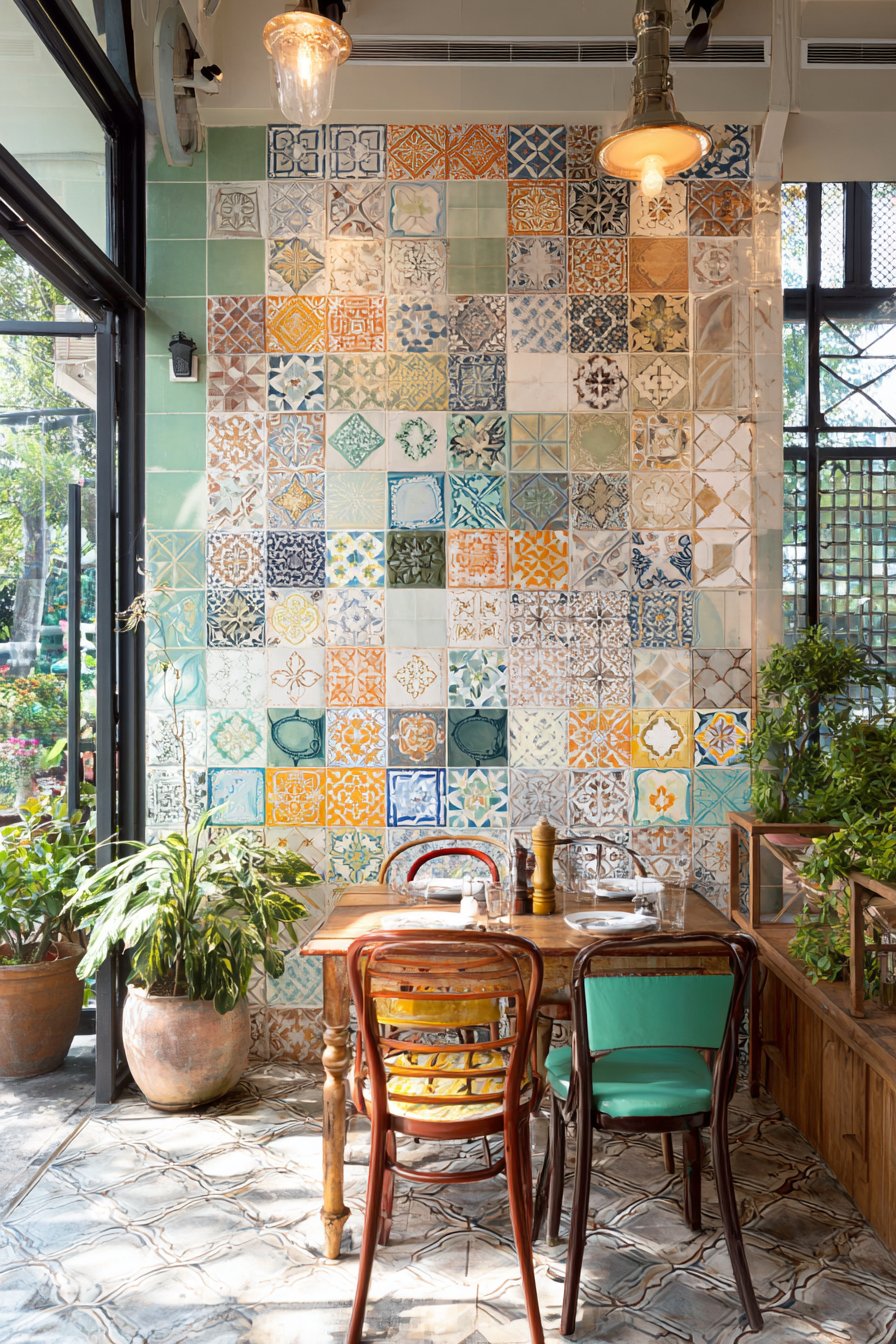 Furnish patchwork-tiled areas with vintage mismatched chairs painted in complementary colors, creating casual dining zones that feel collected rather than purchased all at once. Add colorful cushions, eclectic planters, and whimsical accessories that share the tile wall’s playful spirit without attempting to match it precisely. Bright natural sunlight intensifies the cheerful color palette, while strategic outdoor lighting ensures the vibrant installation remains visible during evening gatherings.