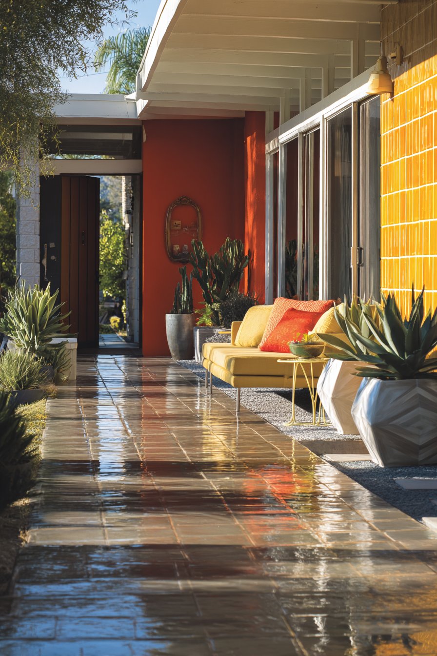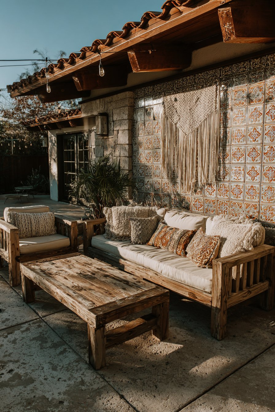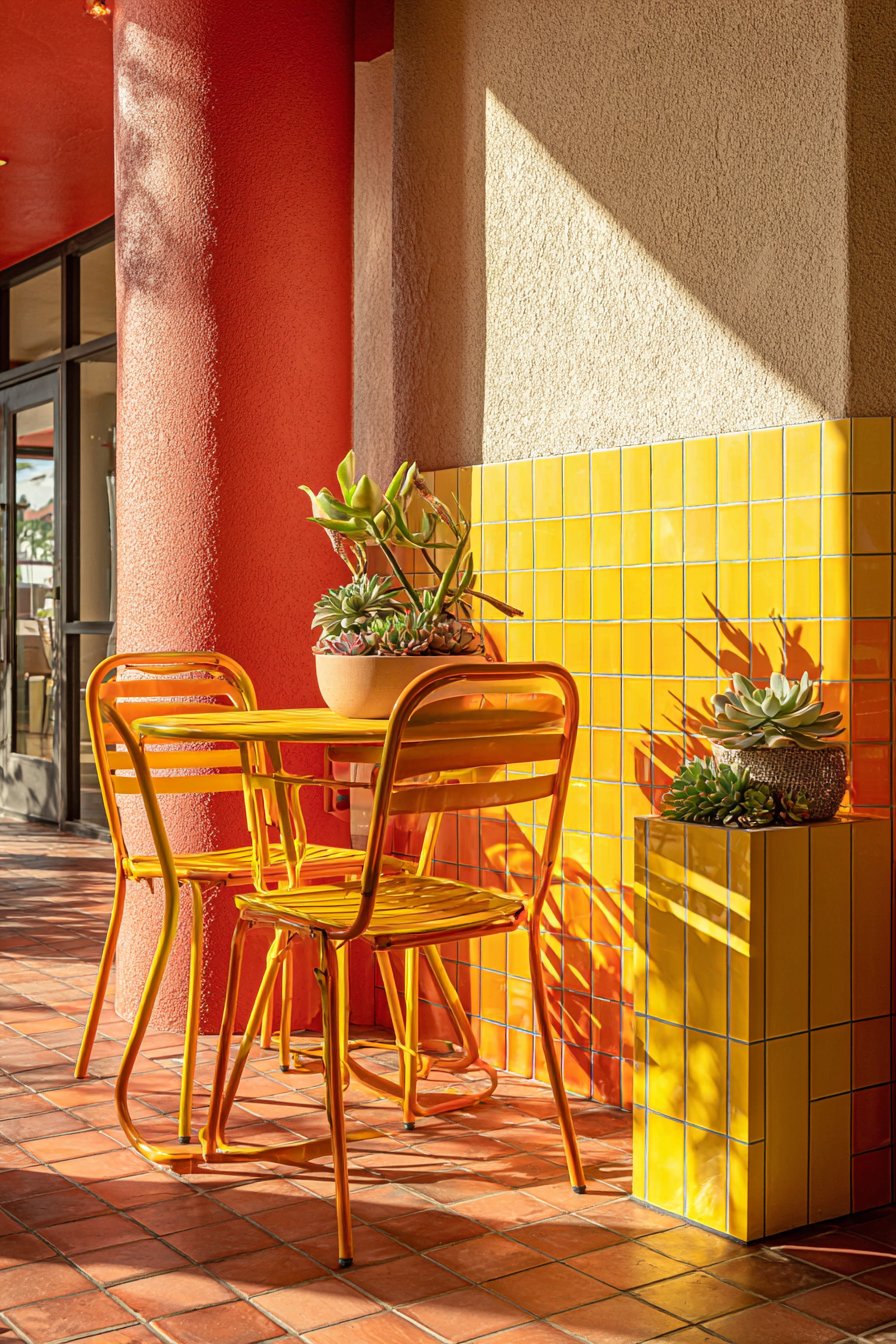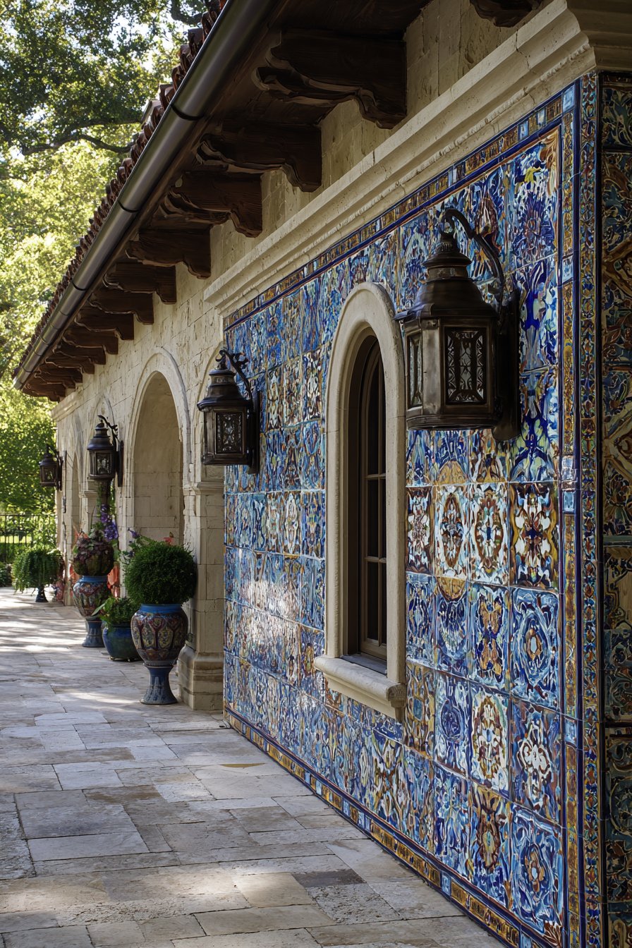 Furnish patchwork-tiled areas with vintage mismatched chairs painted in complementary colors, creating casual dining zones that feel collected rather than purchased all at once. Add colorful cushions, eclectic planters, and whimsical accessories that share the tile wall’s playful spirit without attempting to match it precisely. Bright natural sunlight intensifies the cheerful color palette, while strategic outdoor lighting ensures the vibrant installation remains visible during evening gatherings.