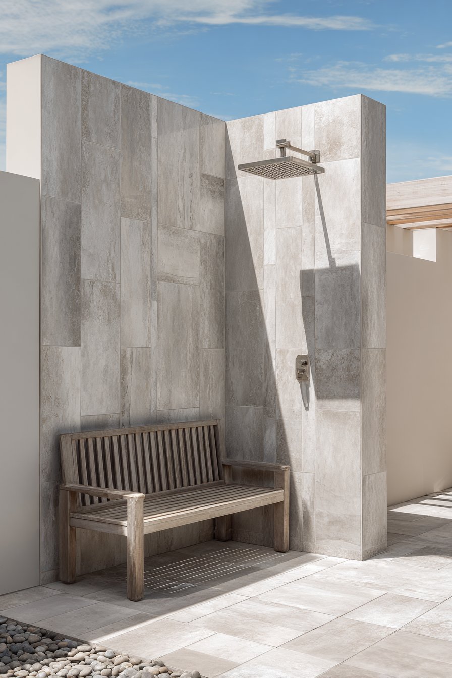 The timeless beauty of travertine finds new expression in contemporary porcelain tiles that capture the stone’s warm, earthy character without the maintenance demands of natural material. Large-format tiles in creamy beige tones with subtle variations create a seamless backdrop that elevates any outdoor seating area. The textured surface mimics travertine’s characteristic pitted appearance, adding tactile interest while maintaining the slip-resistance essential for outdoor applications. When sunlight plays across the surface, these tiles reveal depth and dimension that rivals authentic stone.