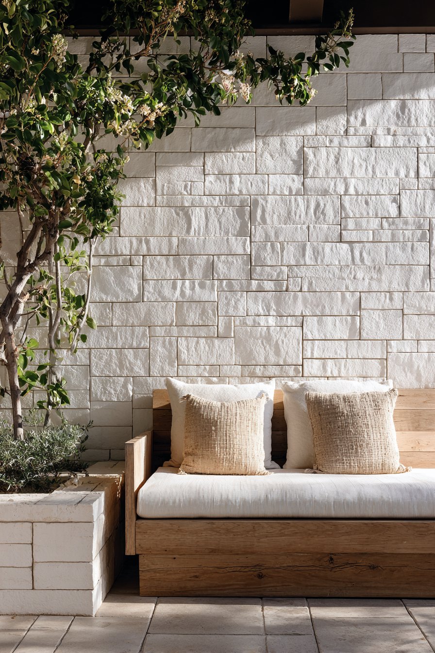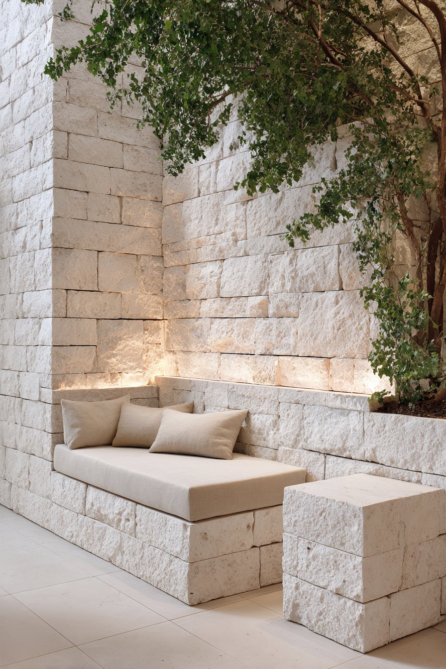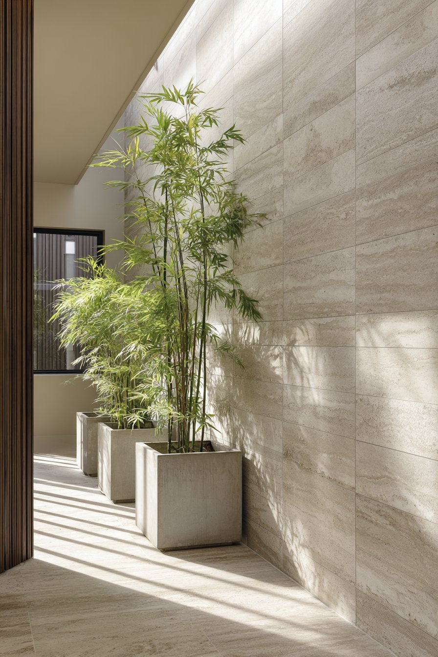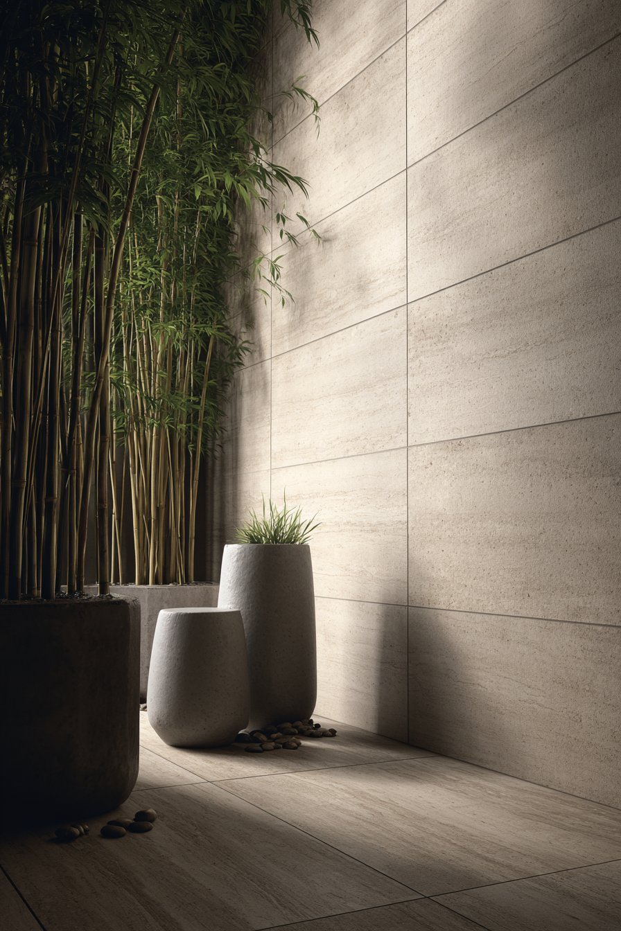 Complement stone walls with carefully selected plants that reinforce the minimalist aesthetic—consider bamboo varieties in sleek concrete planters that echo the tiles’ gray tones. Position floor cushions or a low meditation bench in front of the stone feature, creating a dedicated space for practice that feels removed from daily concerns. Overhead structures that create dappled shade enhance the interplay between light and shadow on the stone surface, adding dynamic visual interest throughout the day.