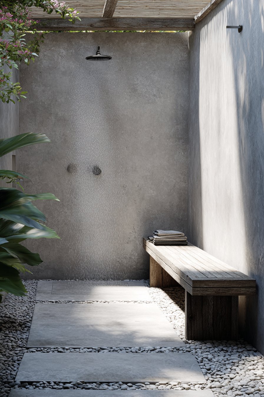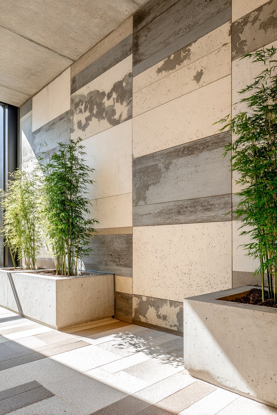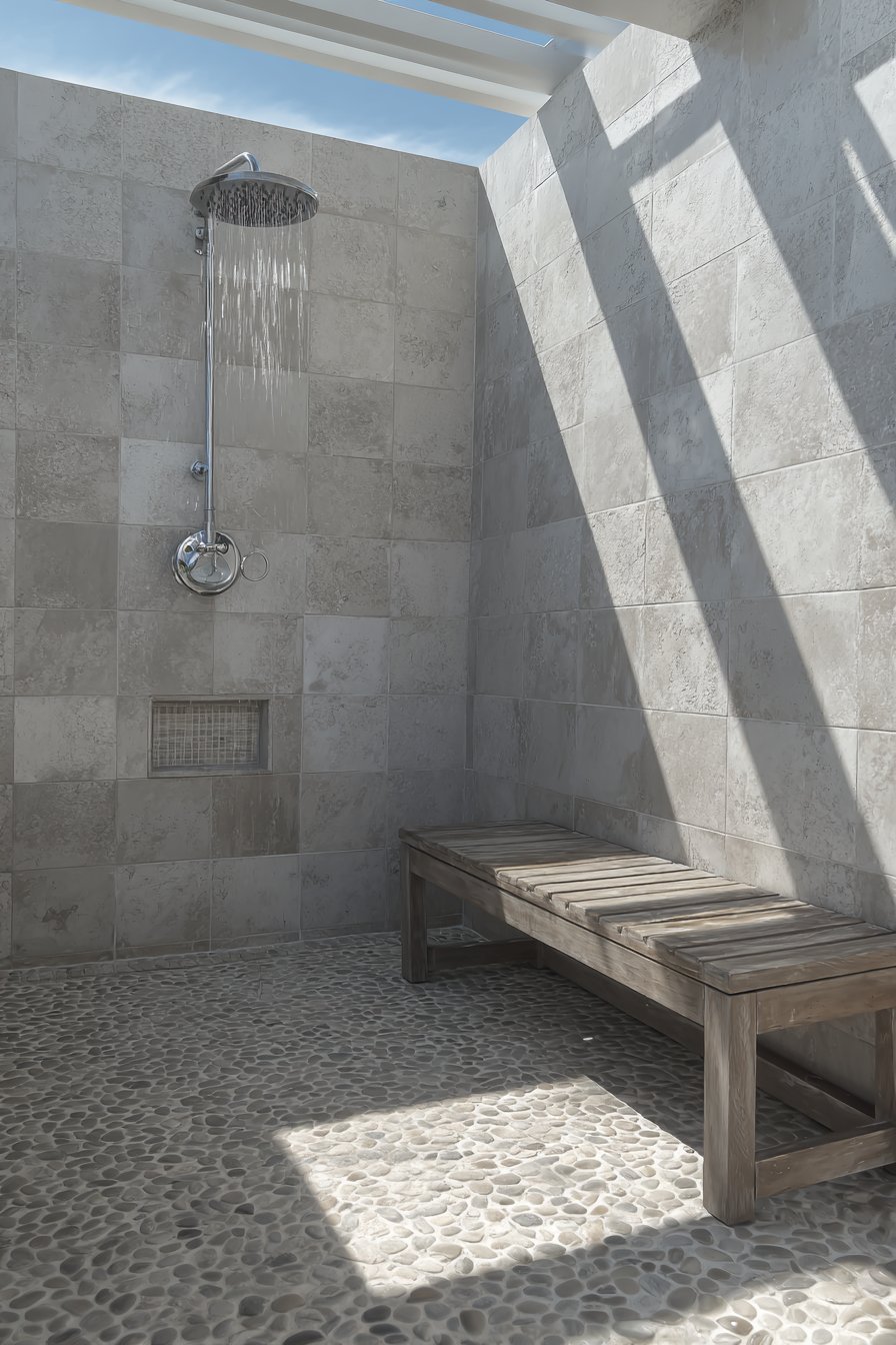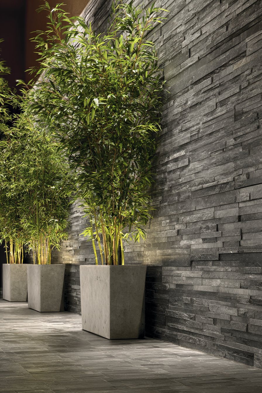 Complement stone walls with carefully selected plants that reinforce the minimalist aesthetic—consider bamboo varieties in sleek concrete planters that echo the tiles’ gray tones. Position floor cushions or a low meditation bench in front of the stone feature, creating a dedicated space for practice that feels removed from daily concerns. Overhead structures that create dappled shade enhance the interplay between light and shadow on the stone surface, adding dynamic visual interest throughout the day.