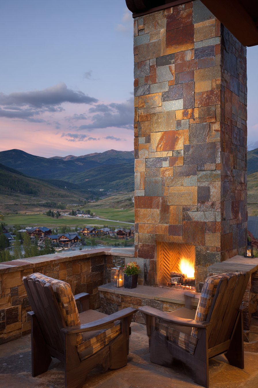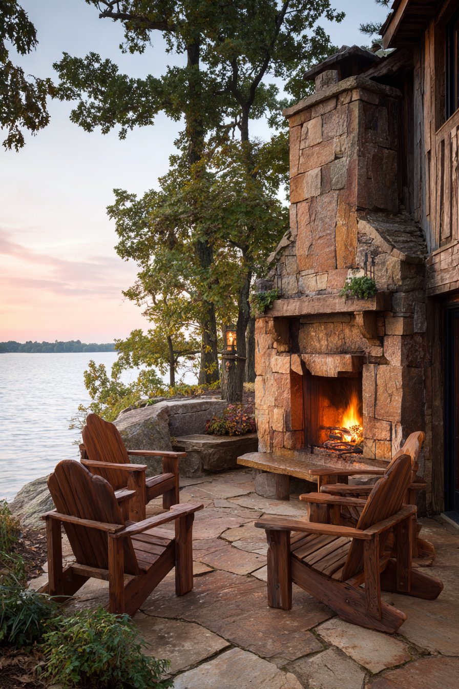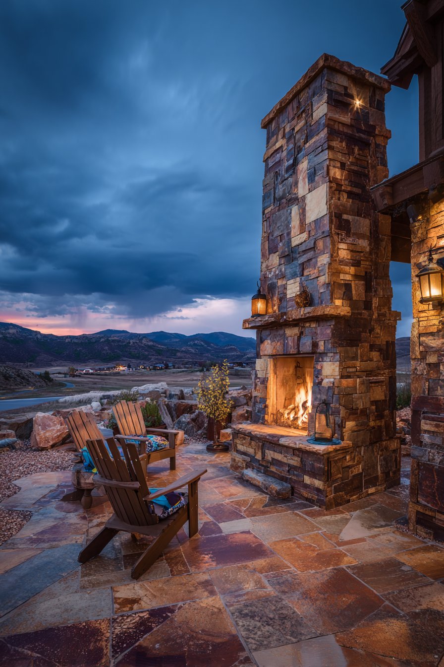 Position Adirondack chairs or rustic benches in semicircles around the stone fireplace, creating defined gathering zones perfect for cool evenings. The rough stone texture contrasts with smooth chair surfaces, while warm firelight dancing across the varied stone colors creates ambiance impossible to replicate with artificial lighting. The heat-resistant properties of natural stone make it ideal for fireplace surrounds, while its durability ensures the installation will maintain beauty through decades of use and weather exposure.