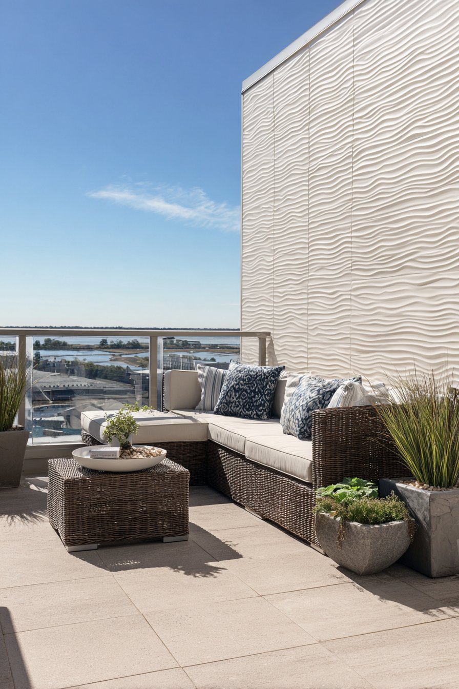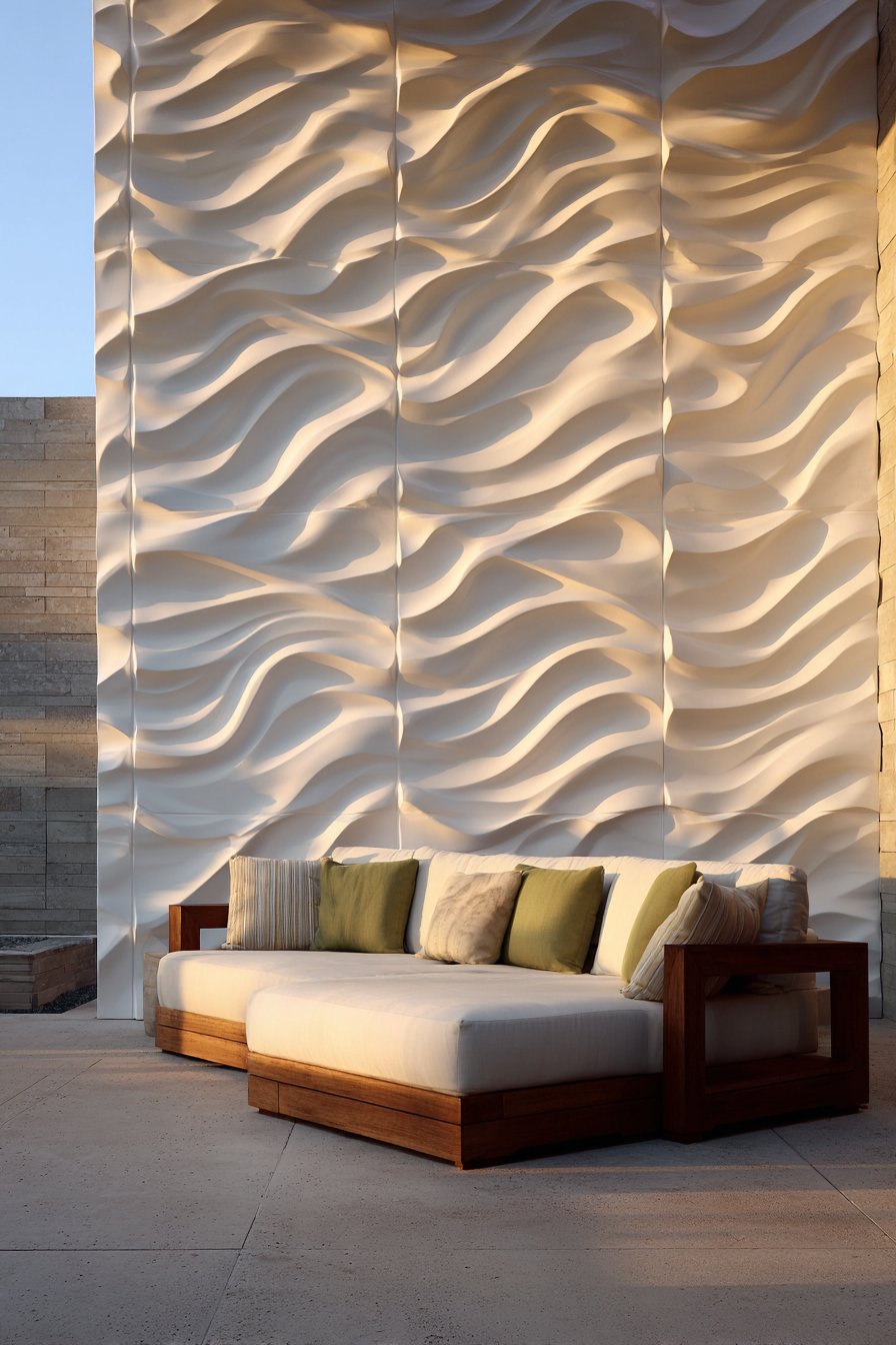 Position modern sectional sofas or contemporary chairs against wave-pattern walls to create outdoor living rooms with gallery-level design. The sculptural backdrop elevates even simple furniture into statements, while the white color ensures compatibility with any cushion colors or textile patterns. Strategic lighting design becomes critical—uplighting from the base or angled illumination from above can be adjusted to create dramatically different shadow patterns, allowing homeowners to modify the wall’s appearance based on mood or occasion.