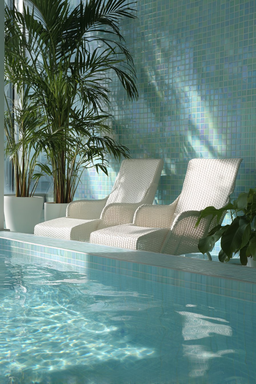 The magic of iridescent glass lies in its ability to create luxury through material properties rather than expensive scale or elaborate patterns. Even modest installations of these tiles deliver high-impact results as reflected pool water creates dancing light patterns across the glass surface. This interplay between water, sunlight, and reflective tile creates mesmerizing effects that captivate attention and enhance the sensory experience of poolside relaxation.