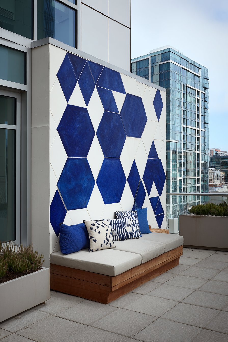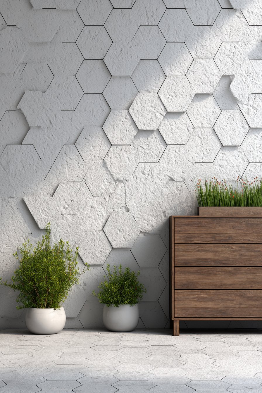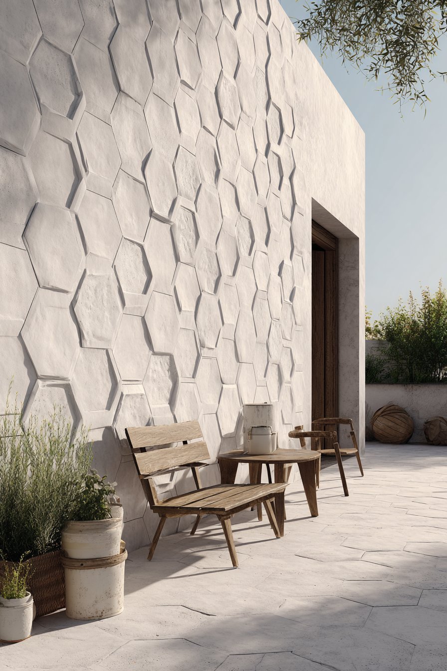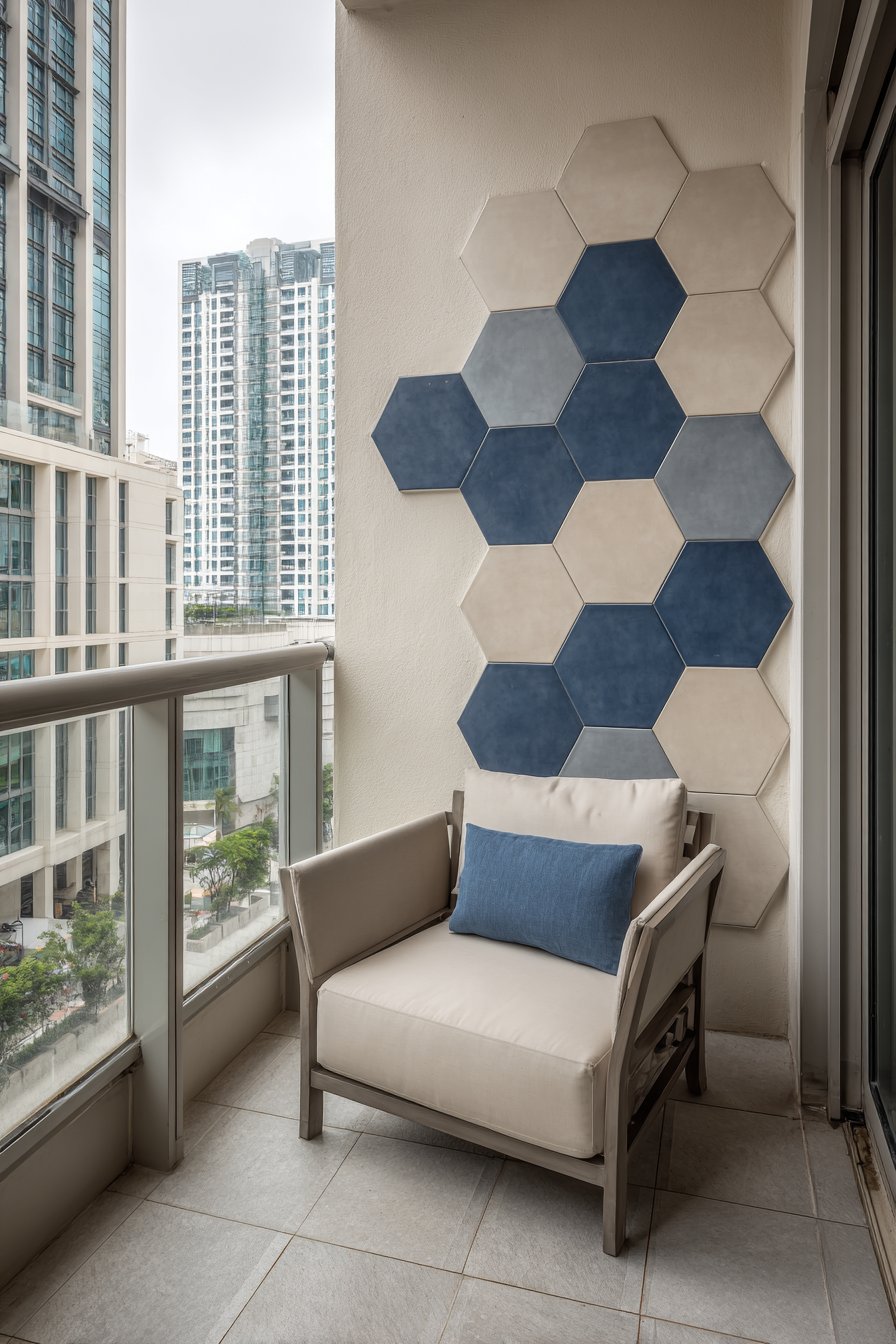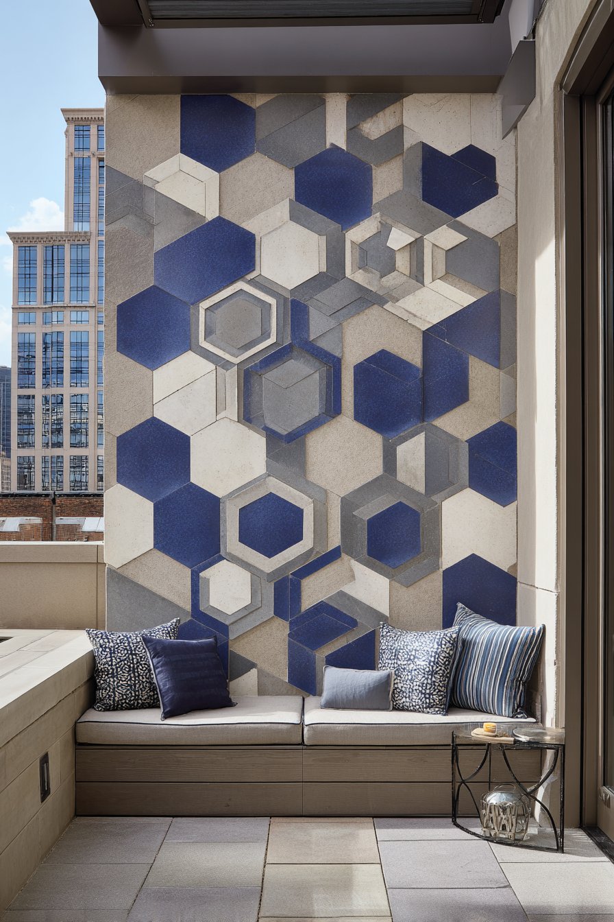 The geometric pattern works particularly well in compact outdoor areas where every design element must earn its place. On small urban balconies, a single accent wall of hexagonal tiles can define the space and create the illusion of greater depth. The repeating pattern draws the eye across the surface, while the dimensional quality of individual hexagons creates subtle shadows that add complexity to the overall composition.