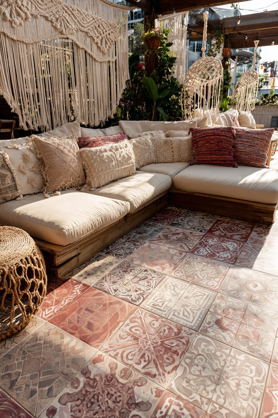 The bohemian aesthetic embraces mixing patterns, colors, and textures that might clash in more formal design approaches. Encaustic tile walls establish this eclectic foundation, providing richly patterned backdrops against which layered textiles, macramé wall hangings, and mixed-material furniture feel perfectly at home. The faded quality of vintage-look tiles prevents patterns from appearing too crisp or new, instead creating the collected-over-time appearance essential to authentic bohemian style.