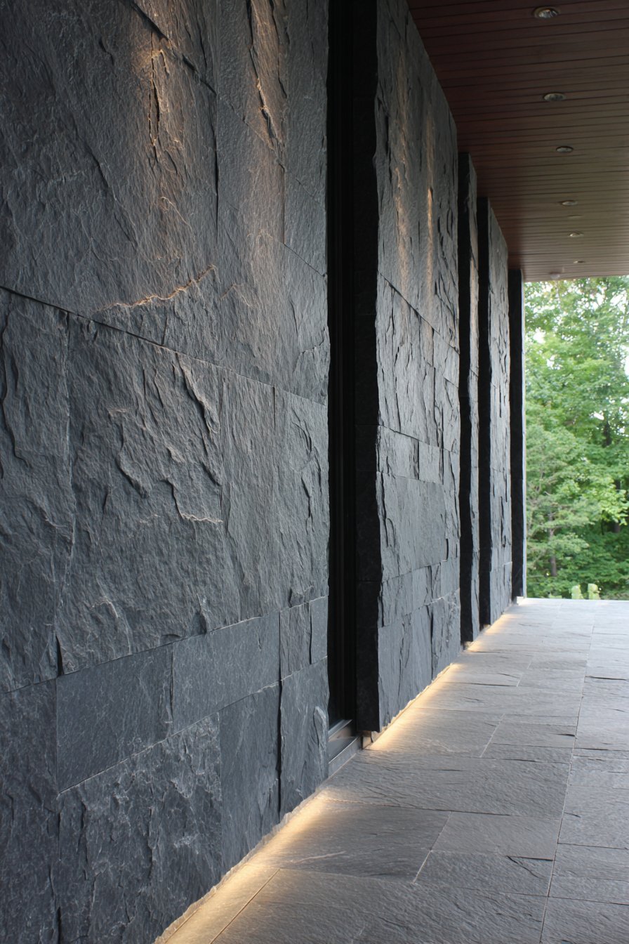 Charcoal-toned ceramic tiles with slate-inspired texture bring sophisticated drama to covered terraces and outdoor living areas. The deep gray coloration provides a striking contrast to natural greenery while creating a moody, contemporary atmosphere that feels both urban and refined. These tiles feature the characteristic cleft surface of natural slate, complete with subtle striations and dimensional variations that catch and reflect light throughout the day. The vertical installation emphasizes ceiling height, making covered outdoor spaces feel more expansive and architecturally significant.