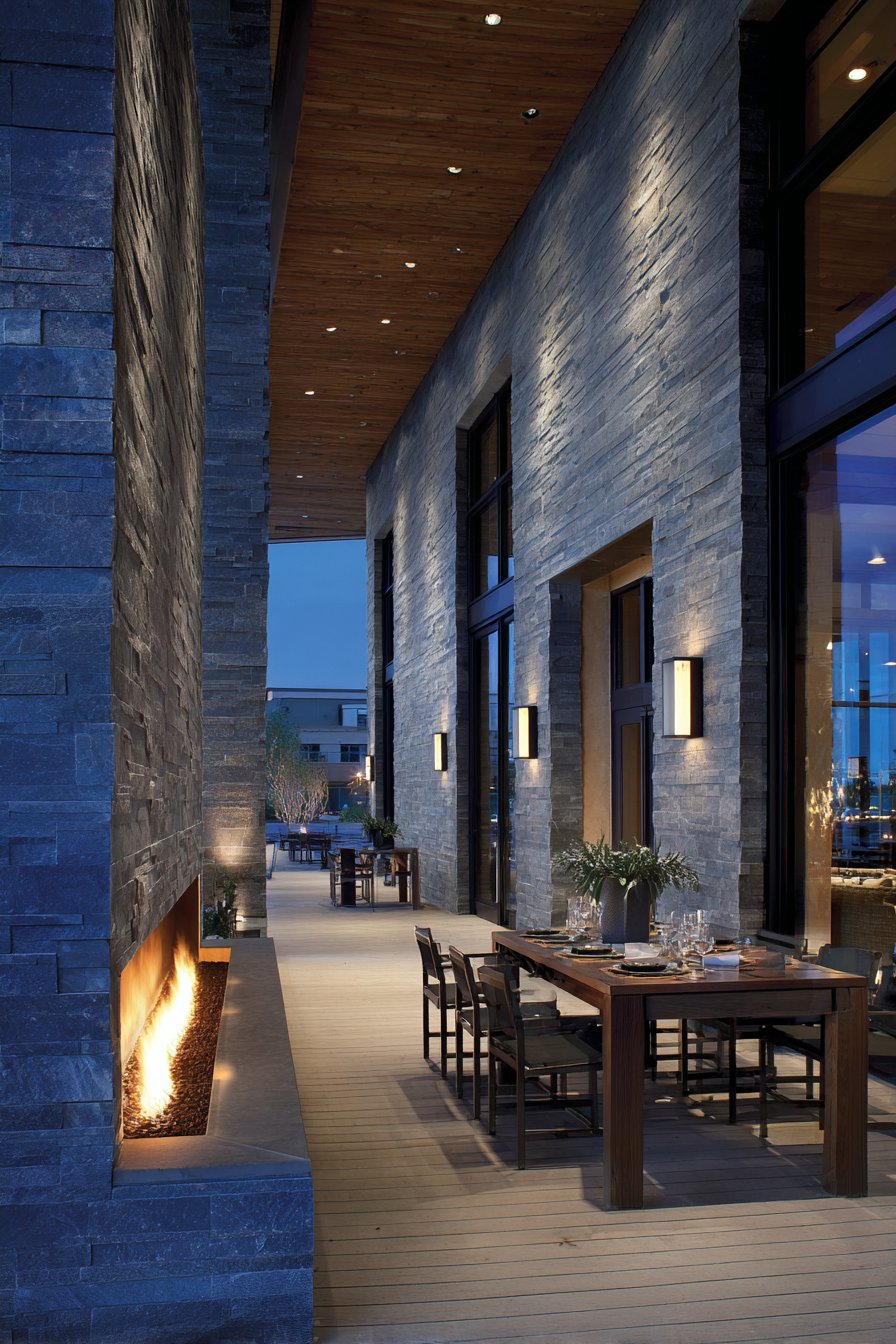 - Incorporate task lighting around seating areas while allowing firelight to illuminate the stone feature