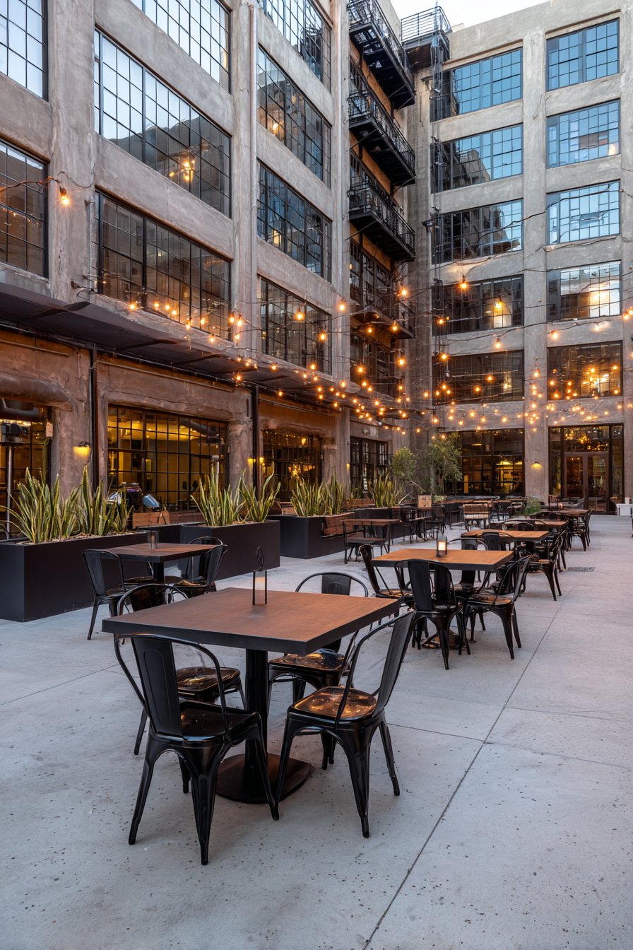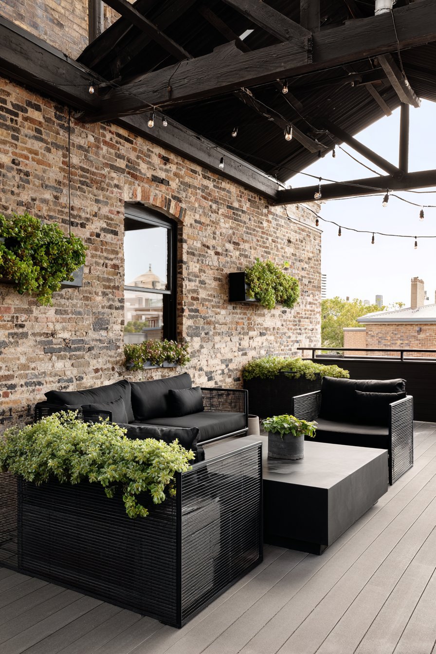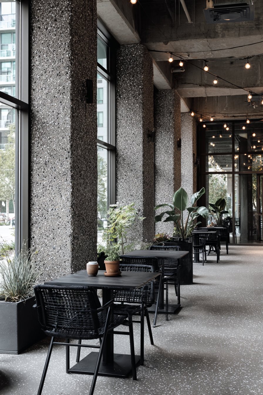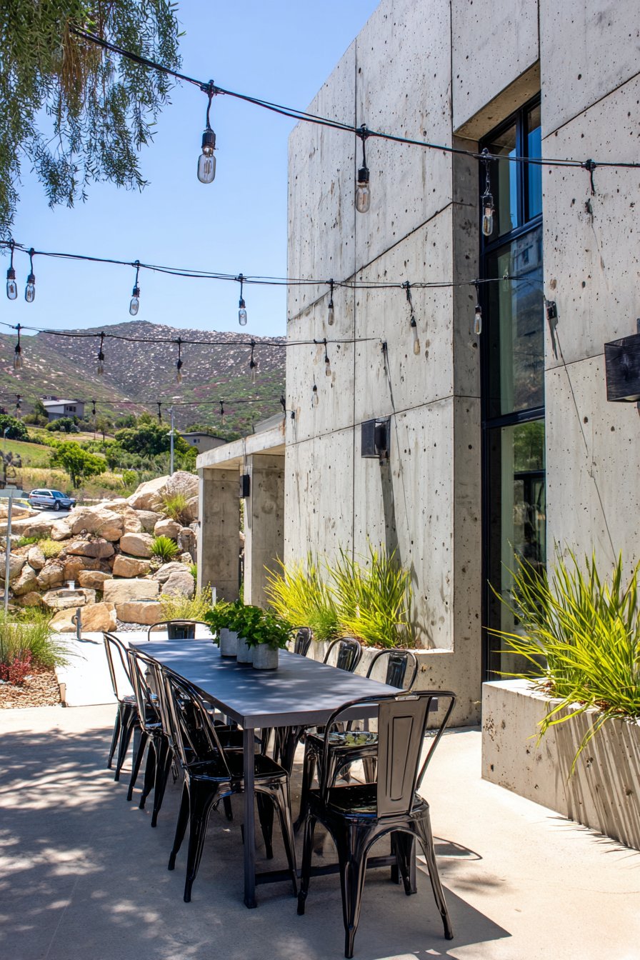 Style exposed aggregate walls with black metal furniture, Edison bulb string lights, and architectural plants like ornamental grasses or sculptural agaves in concrete planters. The deliberately unfinished quality of the concrete pairs perfectly with raw steel, reclaimed wood accents, and utilitarian elements like metal grating or pipe fittings used decoratively. The resulting space feels urban, contemporary, and sophisticated while maintaining the approachability of honest materials and straightforward construction.