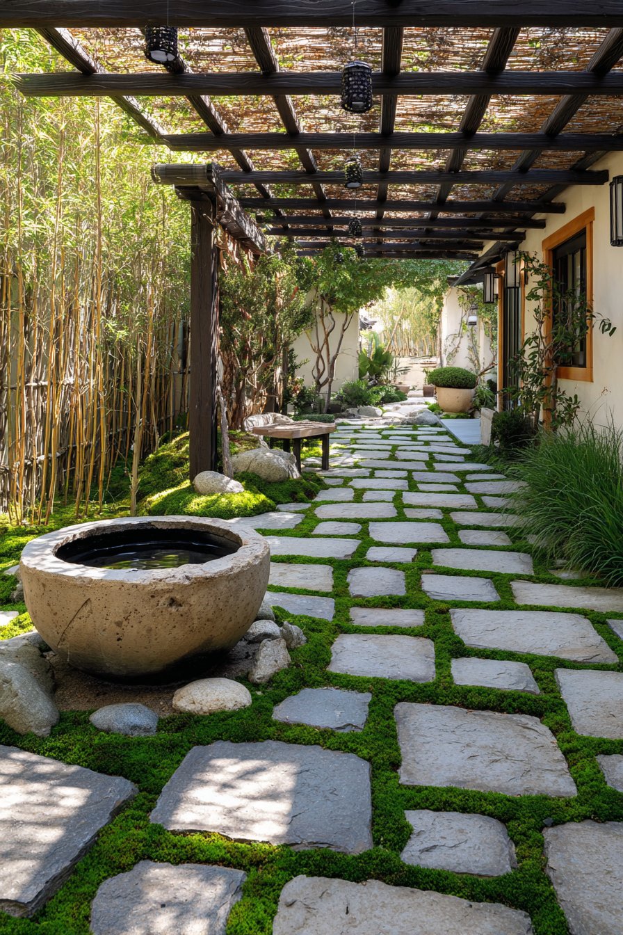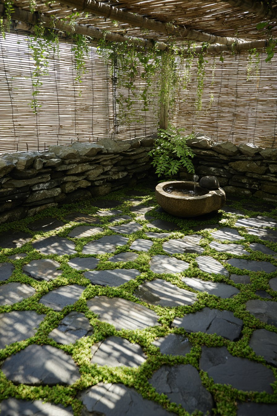Dark gray slate tiles installed with deliberate irregular spacing embrace Japanese wabi-sabi philosophy, finding beauty in imperfection and impermanence. The natural moss growth encouraged between tiles adds organic softness to the hard stone surface, creating living installations that change with seasons and weather. This approach rejects the Western preference for pristine maintenance, instead celebrating the natural processes of weathering, aging, and gradual transformation that connect outdoor spaces to nature’s rhythms.
