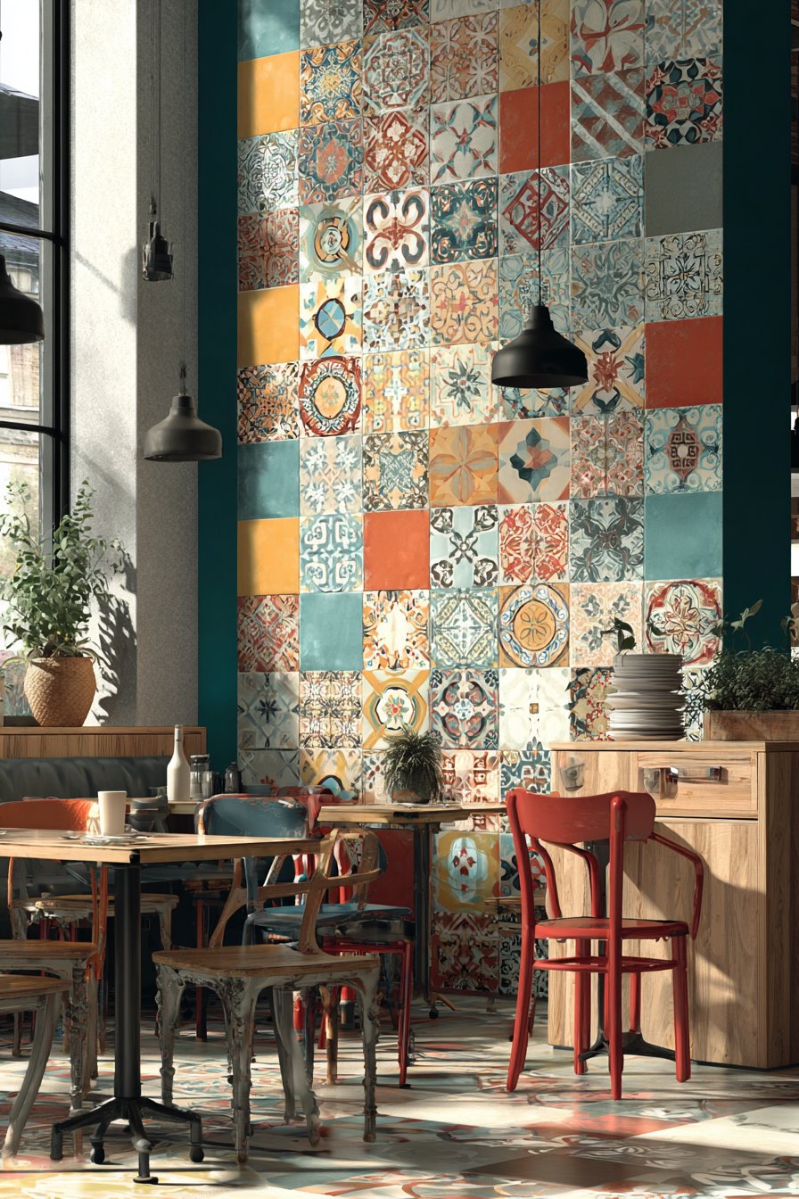 - Balance busy patterns with some solid-color tiles to prevent visual overwhelm